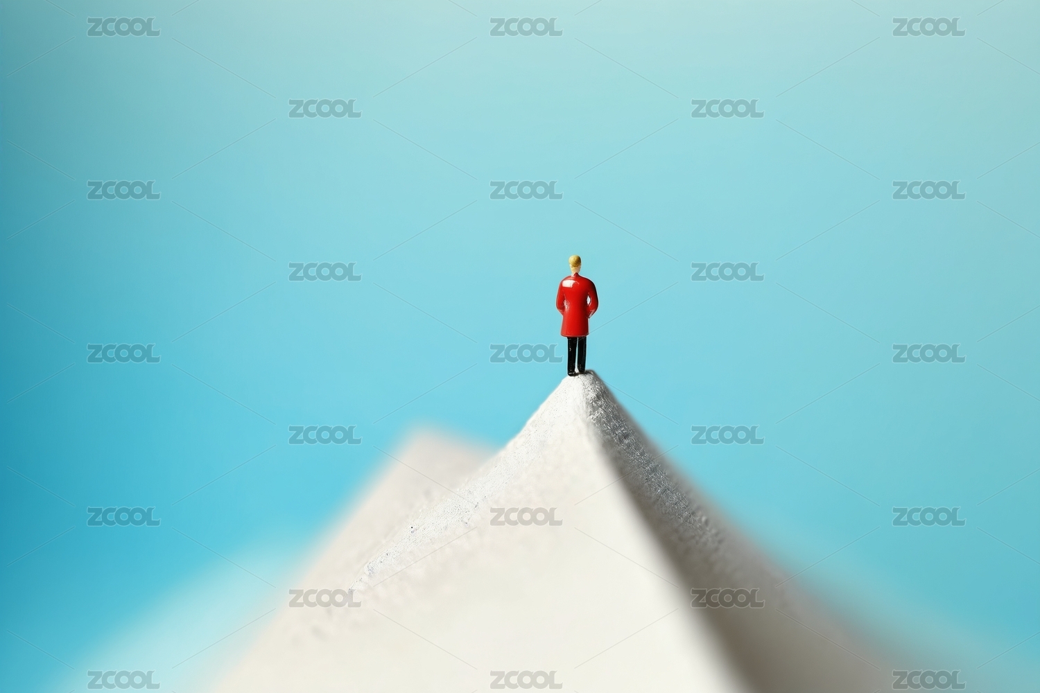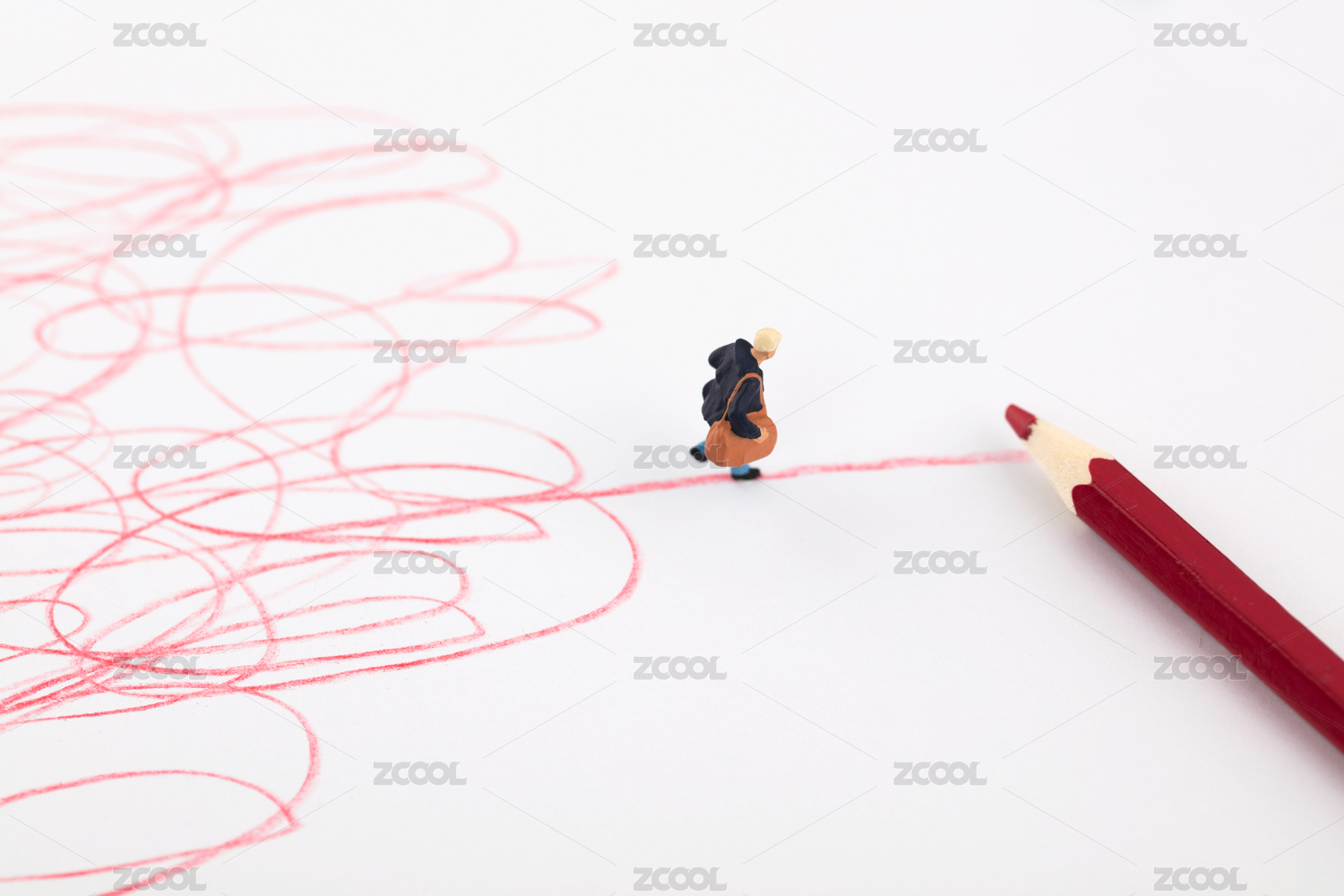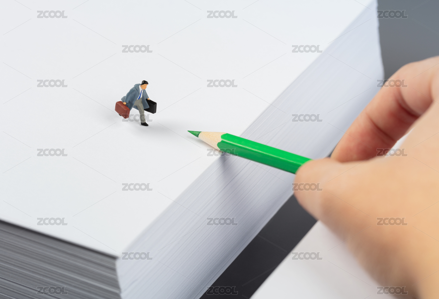 黄色卡纸背景中台灯照站在铅笔上看书的男士