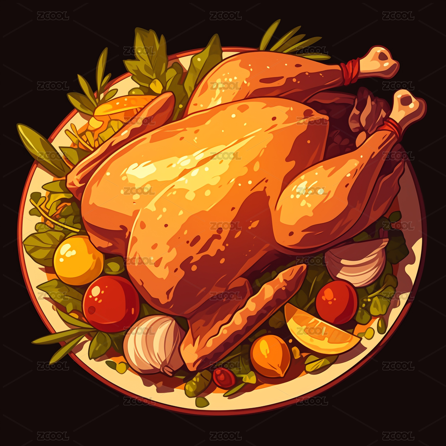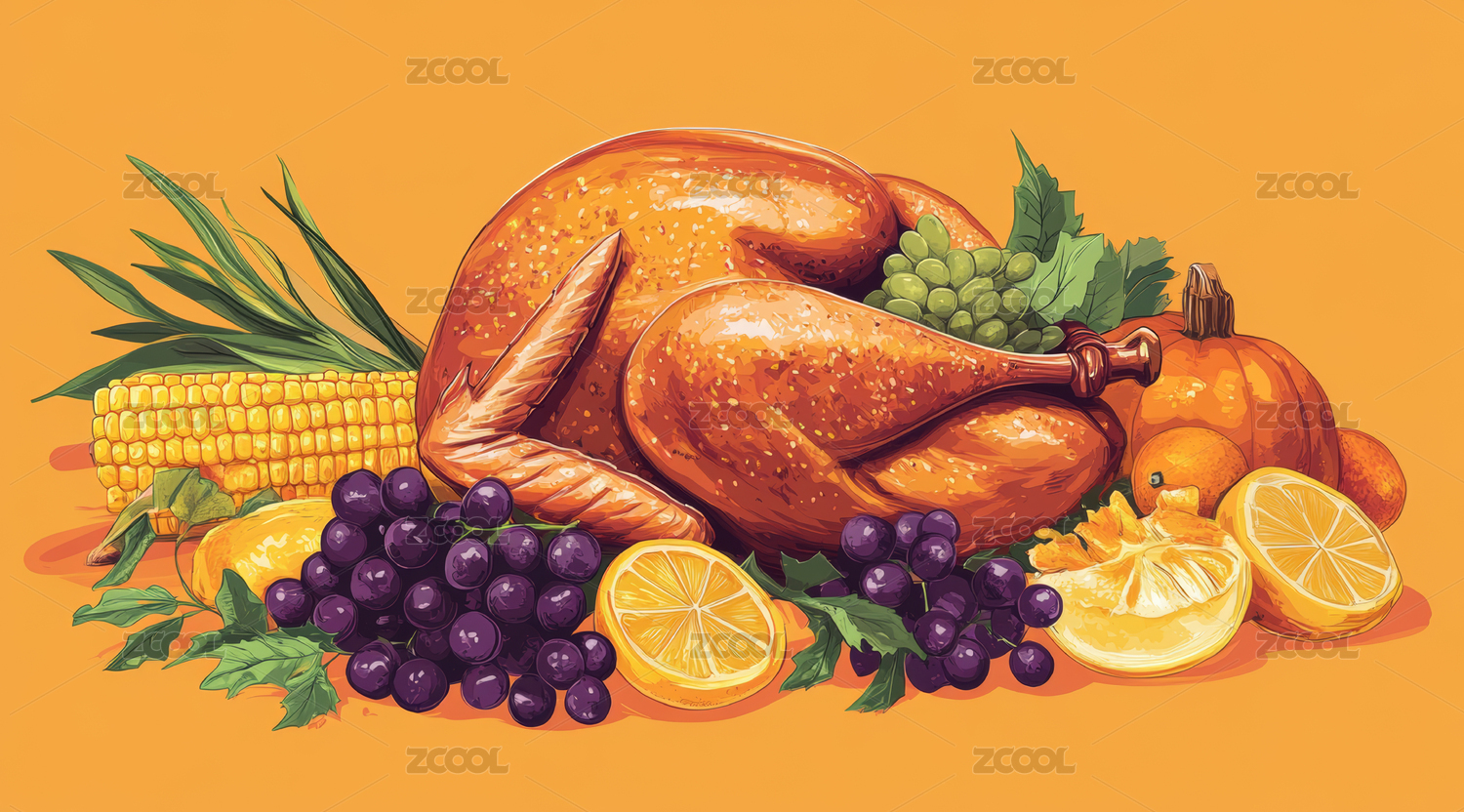 复古美式感恩节诱人的烤鸡点缀着水果蔬菜