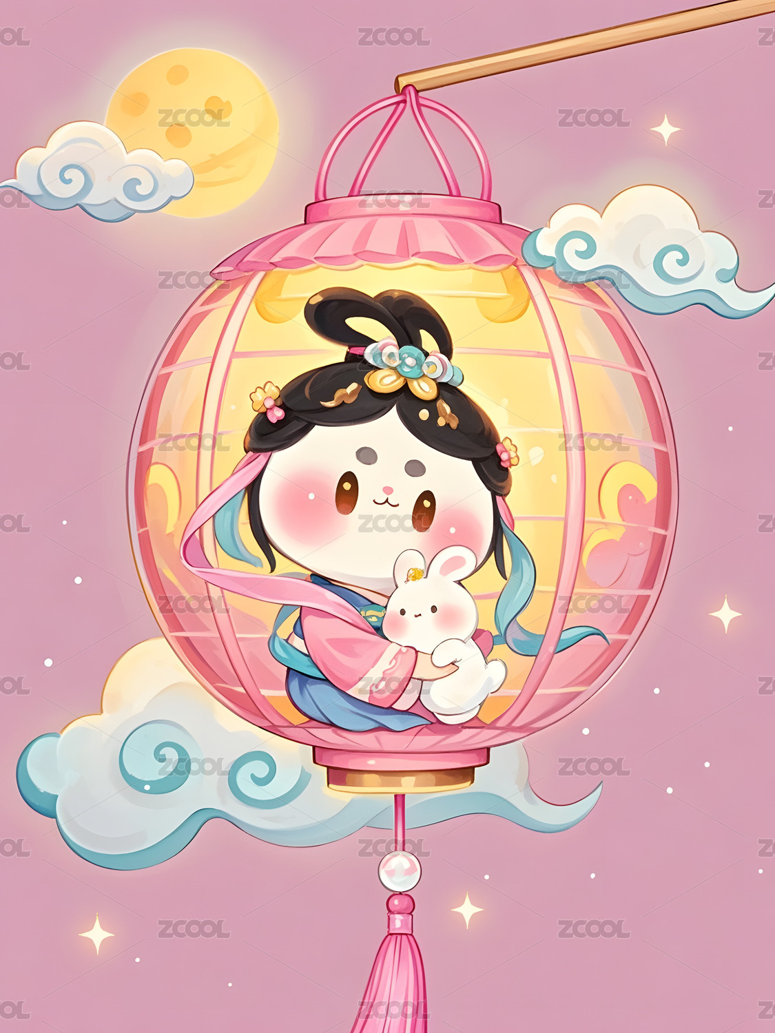 粉色灯笼嵌卡通人物兔子与云