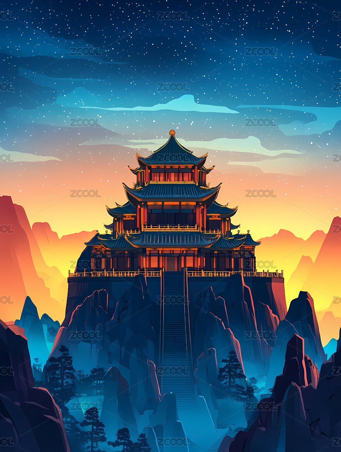 中国风古楼建筑传统国风古建筑国潮插画背景