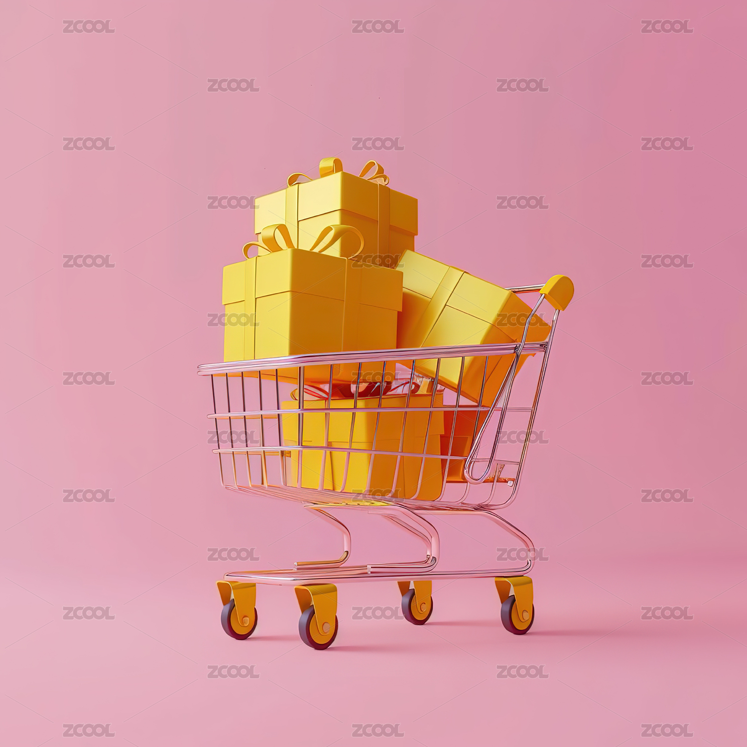 粉红色背景下购物车里的礼物特写镜头