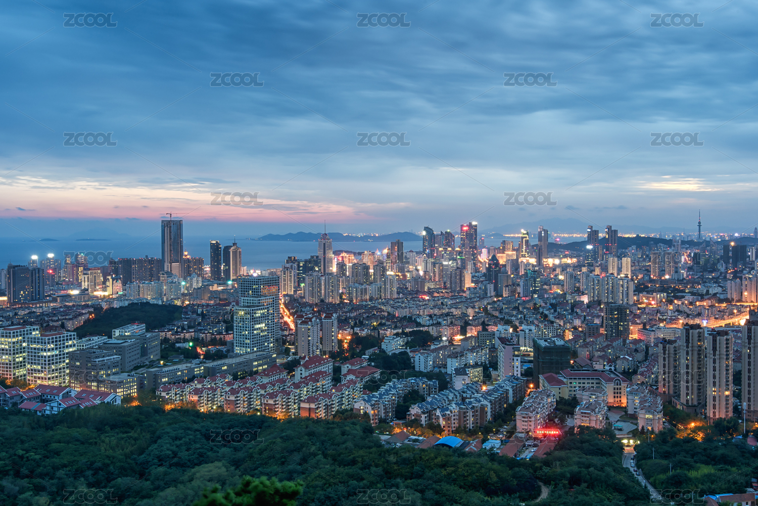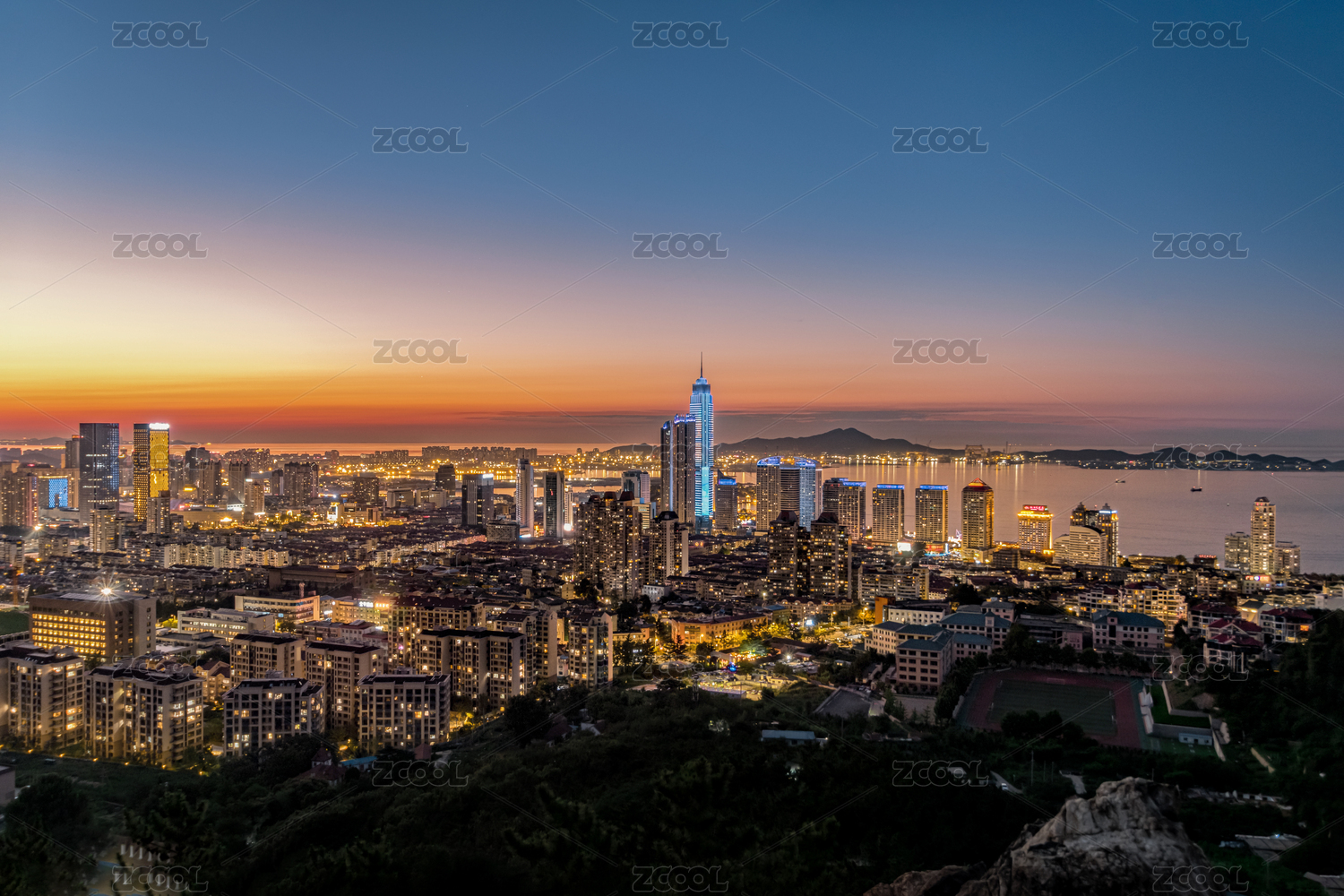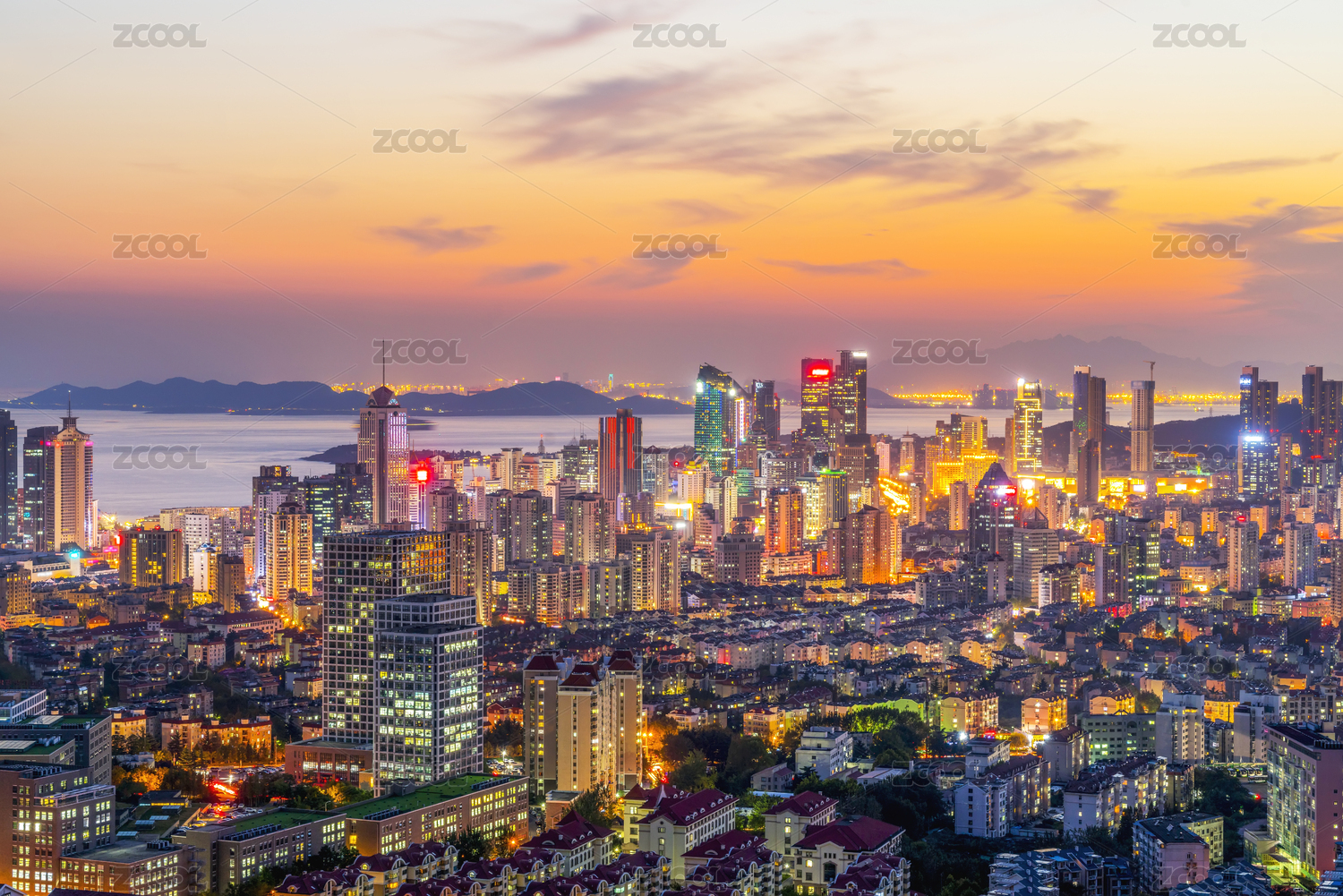 俯拍青岛现代建筑风光和夕阳日落自然景观