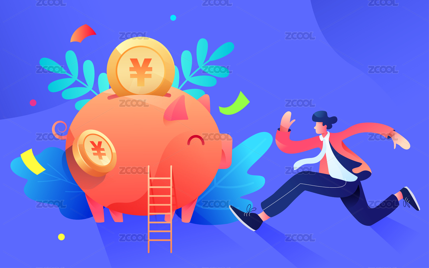 人物奔向存钱罐储蓄赚钱矢量插画背景素材