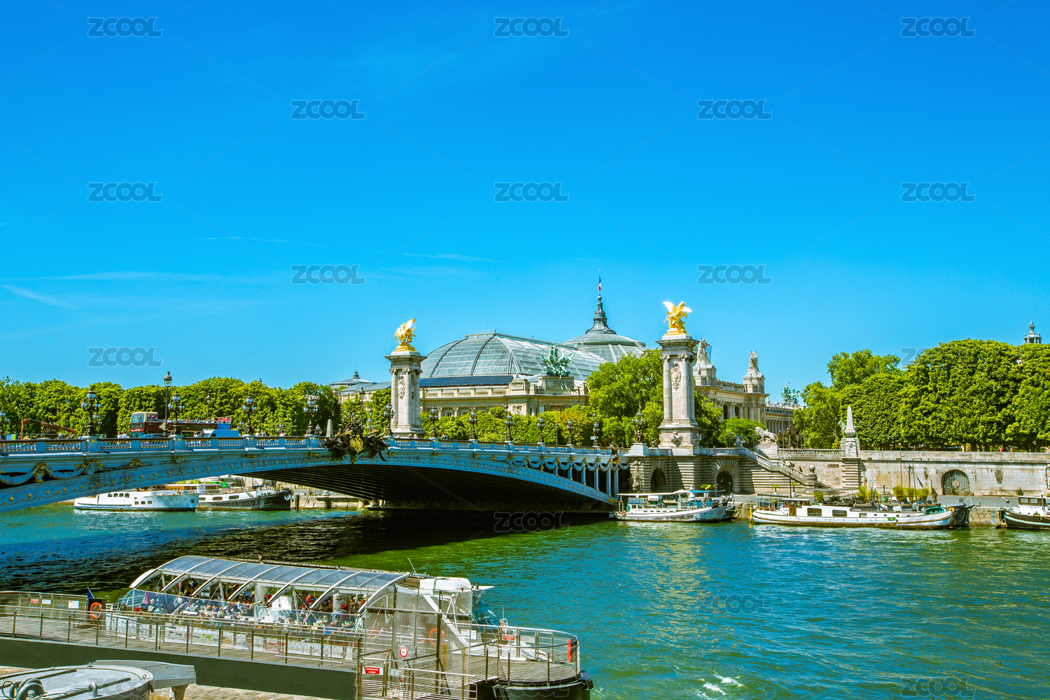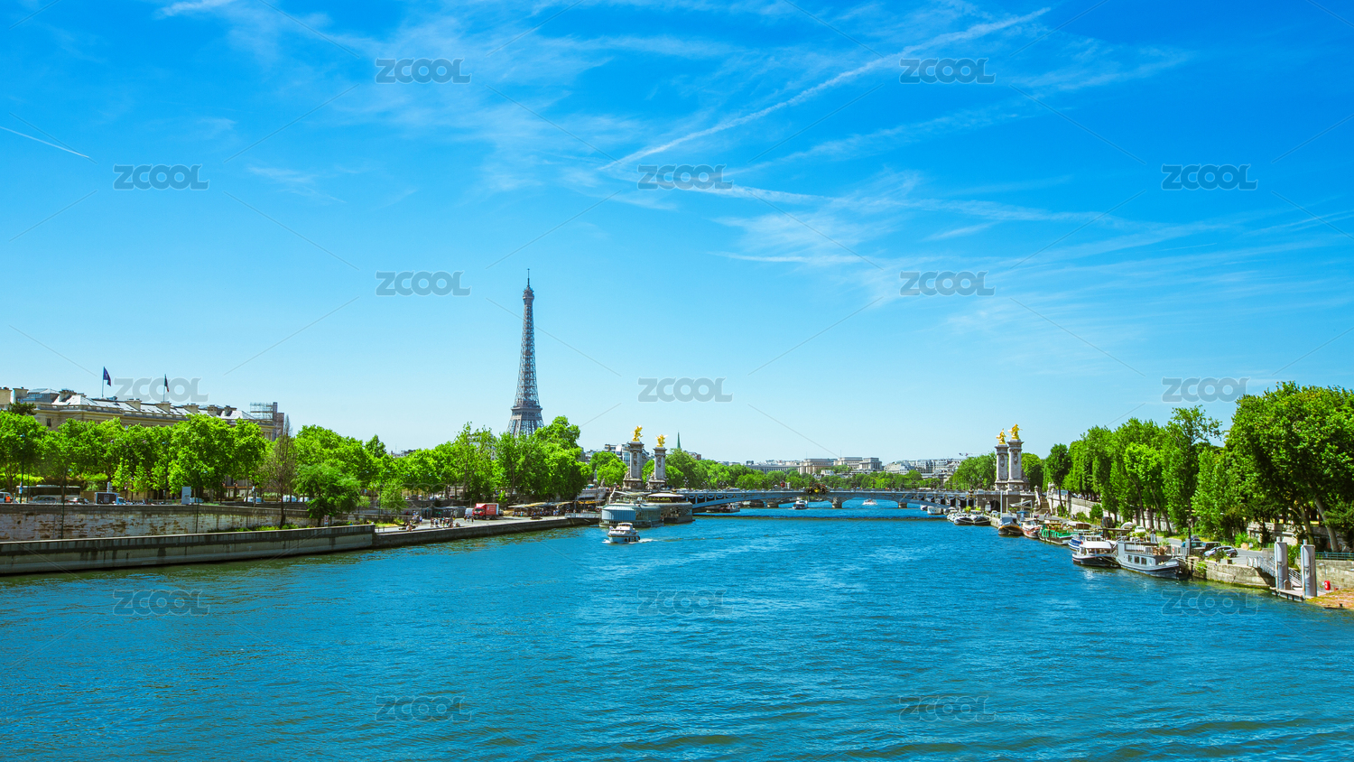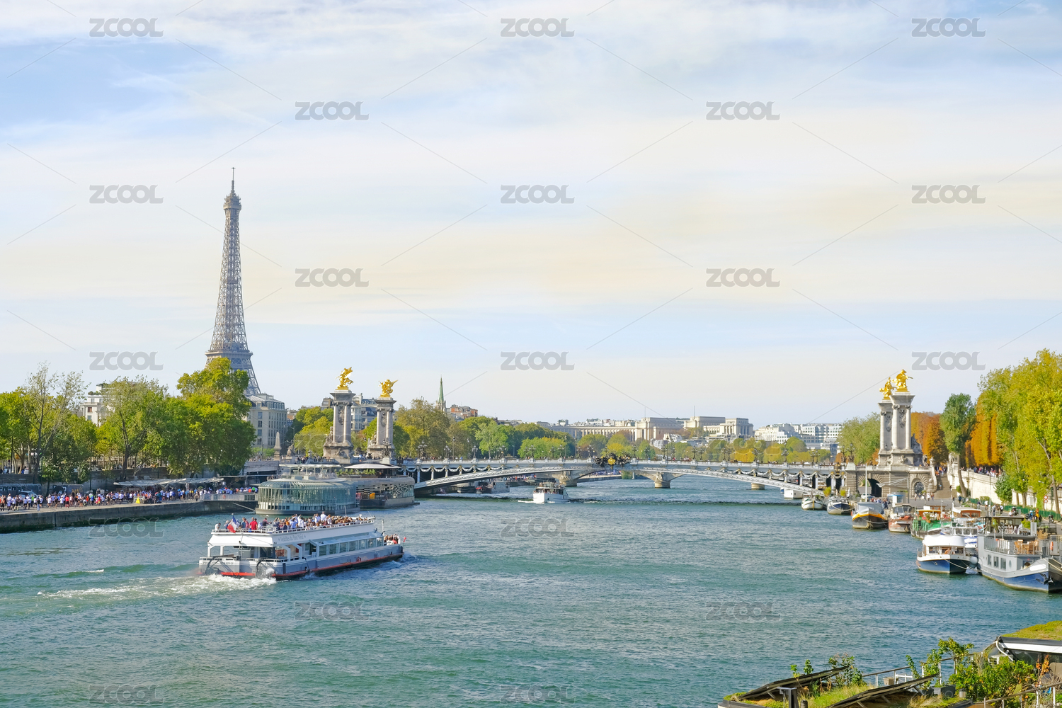 巴黎塞纳河远眺亚历山大三世桥和埃菲尔铁塔