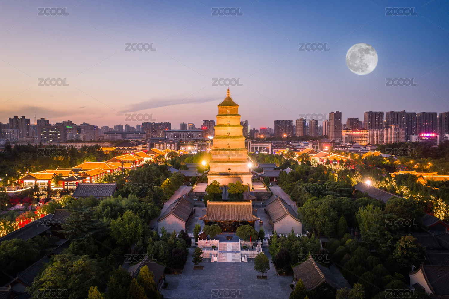 夕阳下的中国西安大雁塔和市区的现代建筑夜景