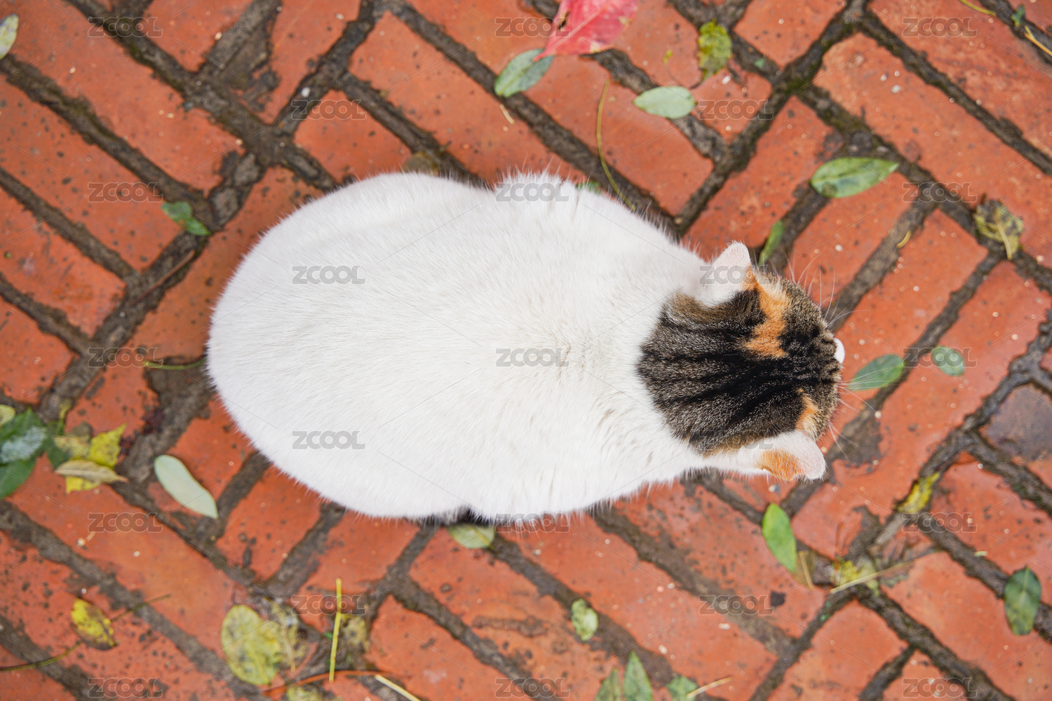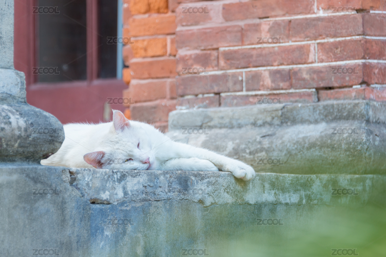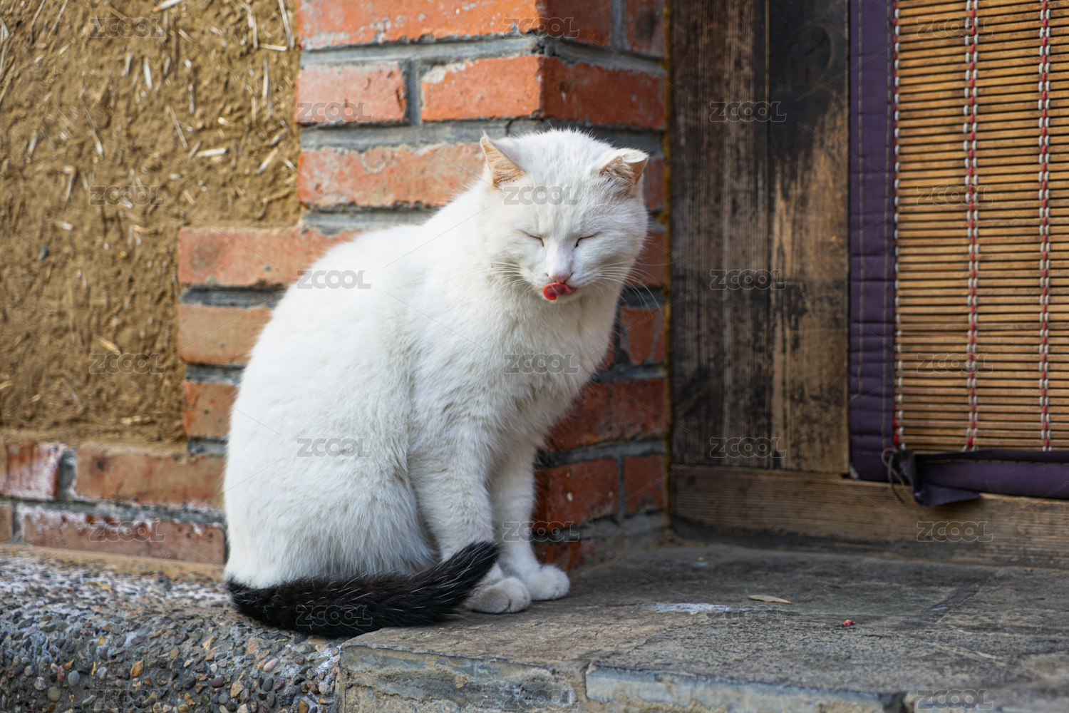街边的白猫红砖建筑青苔