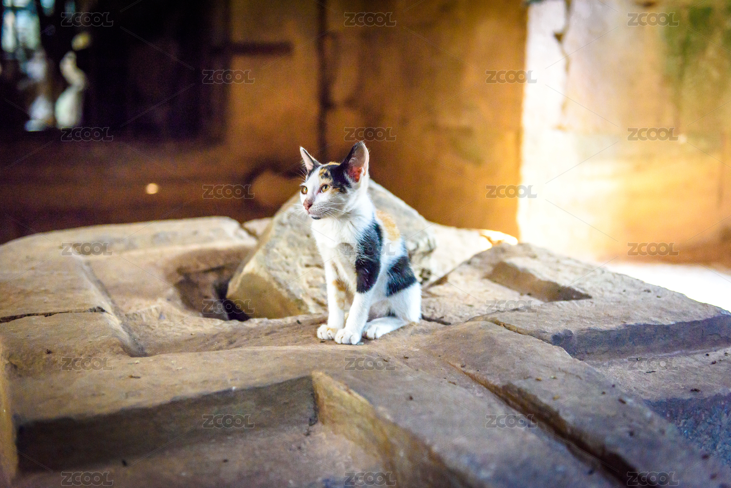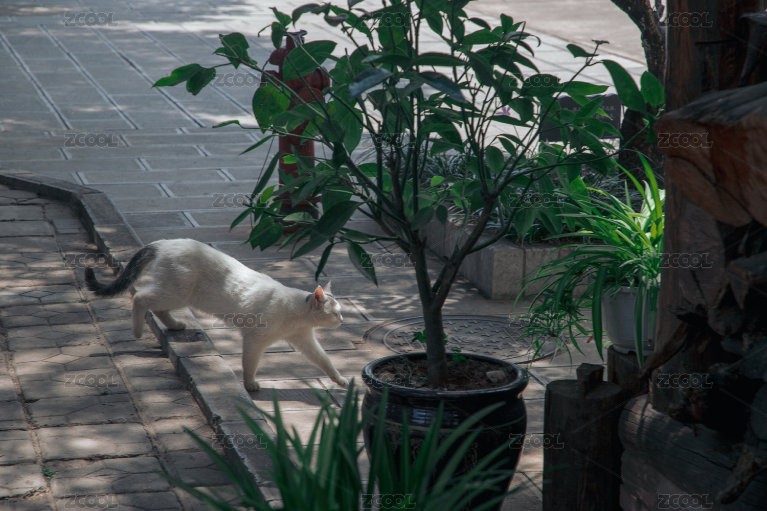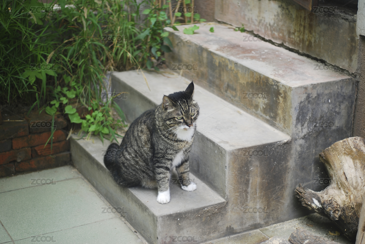 街边的白猫红砖建筑青苔