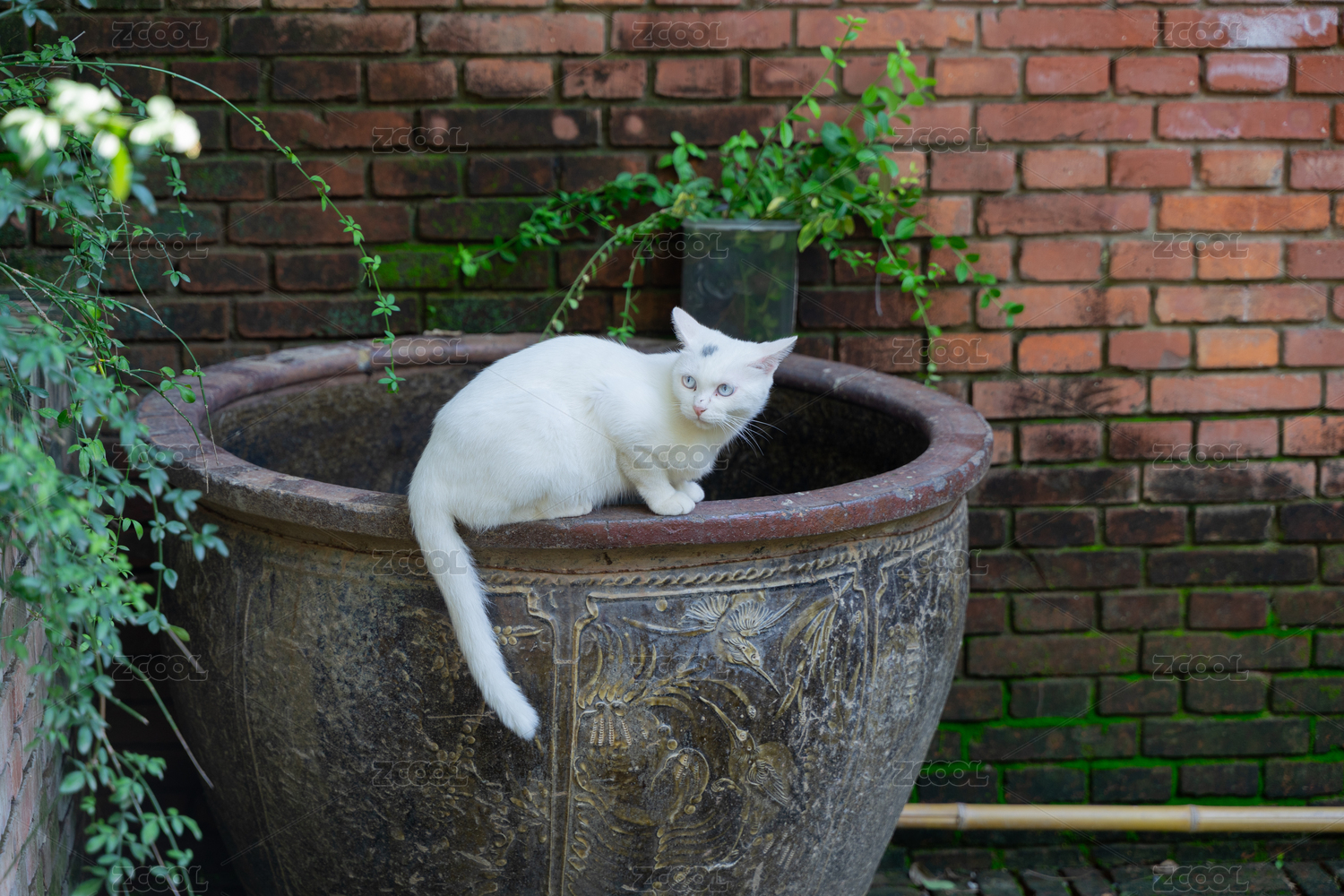 白猫在水缸上休息红砖建筑青苔