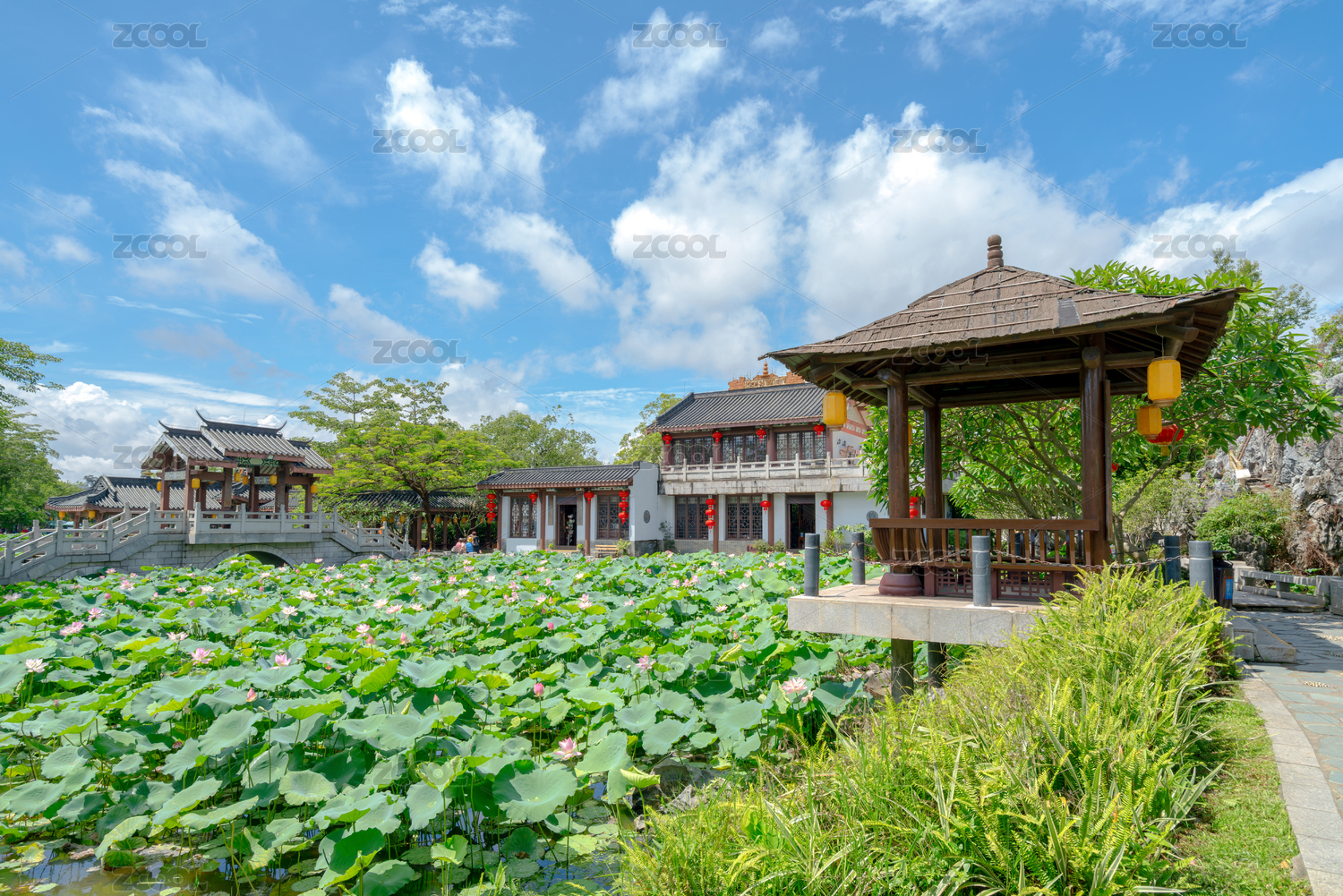 广东清远佛冈上岳古村里湖泊的雨后风光
