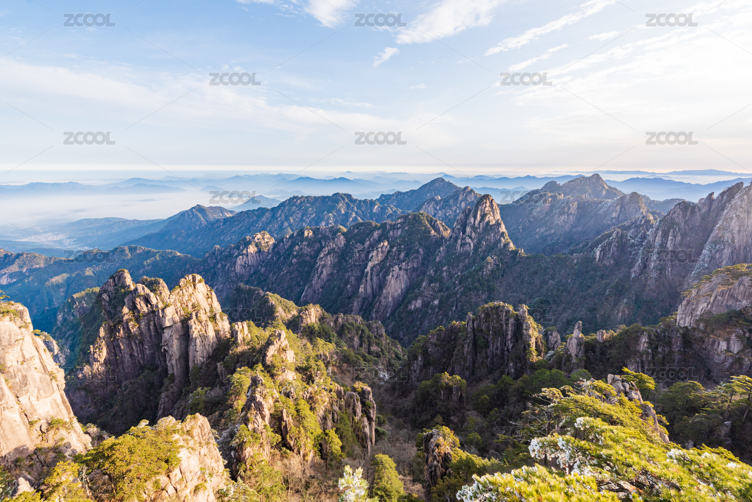 中国安徽黄山冬季晴天早上的猴子观海景点