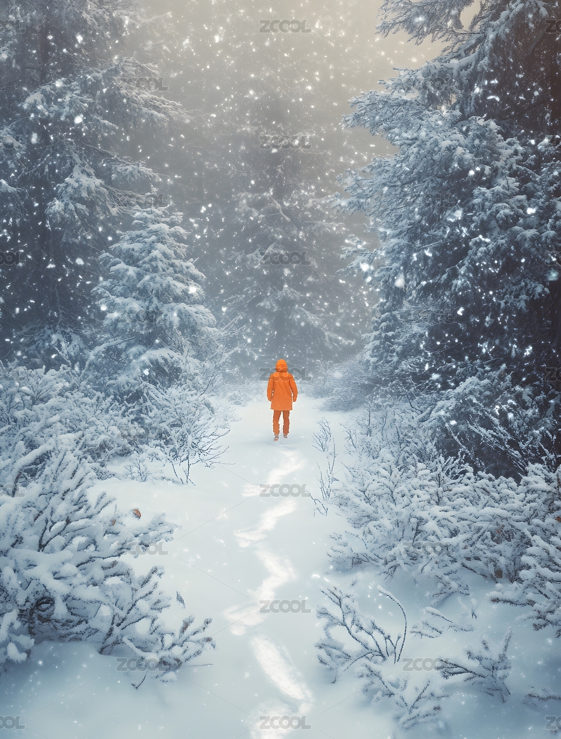 雪景,冬季,树林,人影,行走,雪地,路径,寒冷,孤独,背影