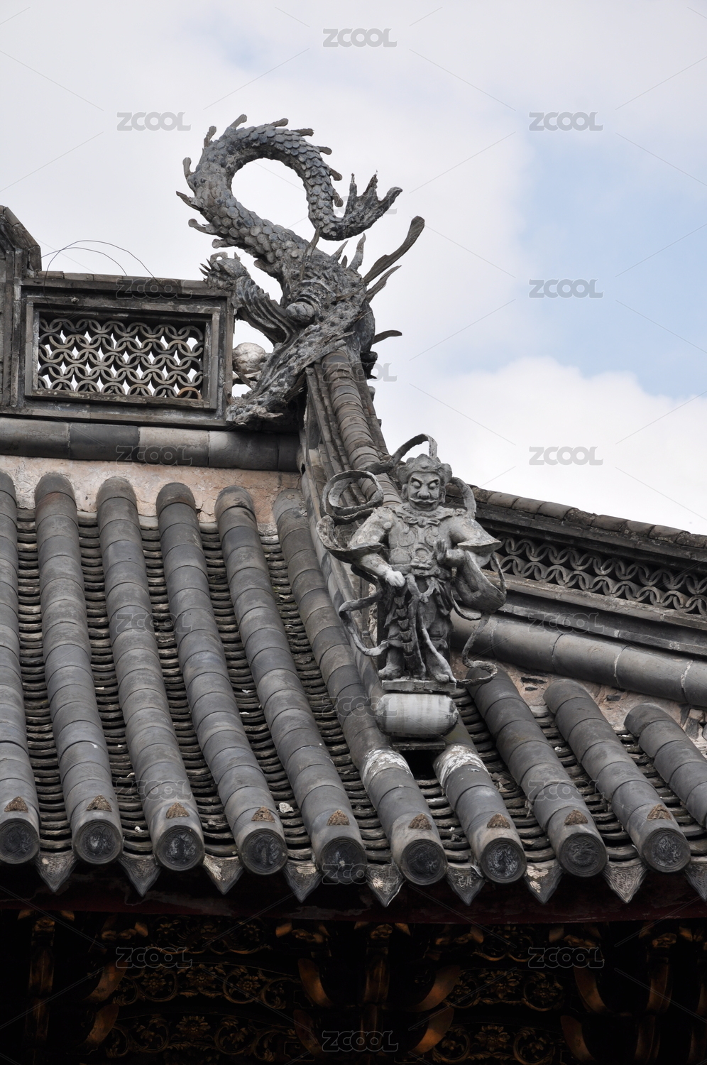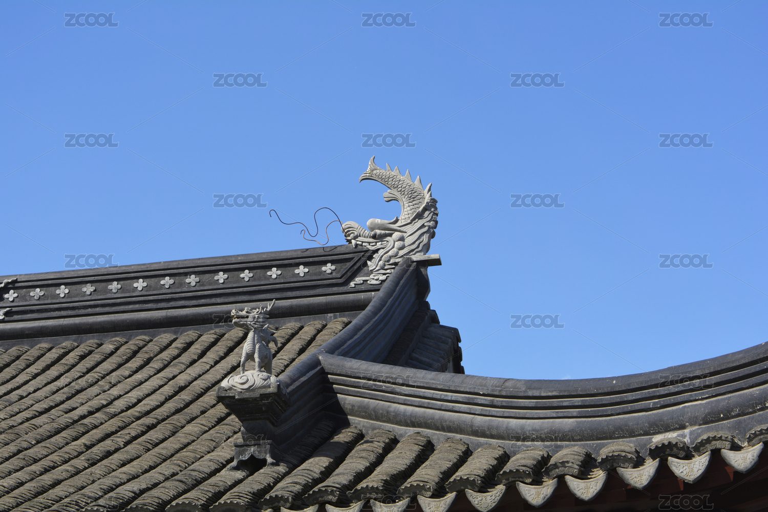 中式古代建筑屋顶瓦片瑞兽麒麟、龙特写