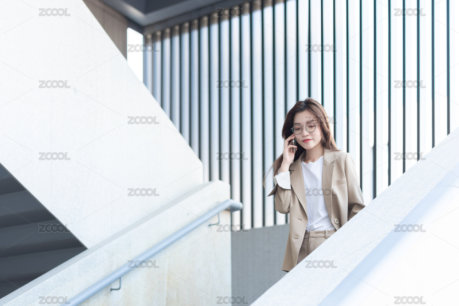 年轻亚洲商务人士站在户外走廊的栏杆旁