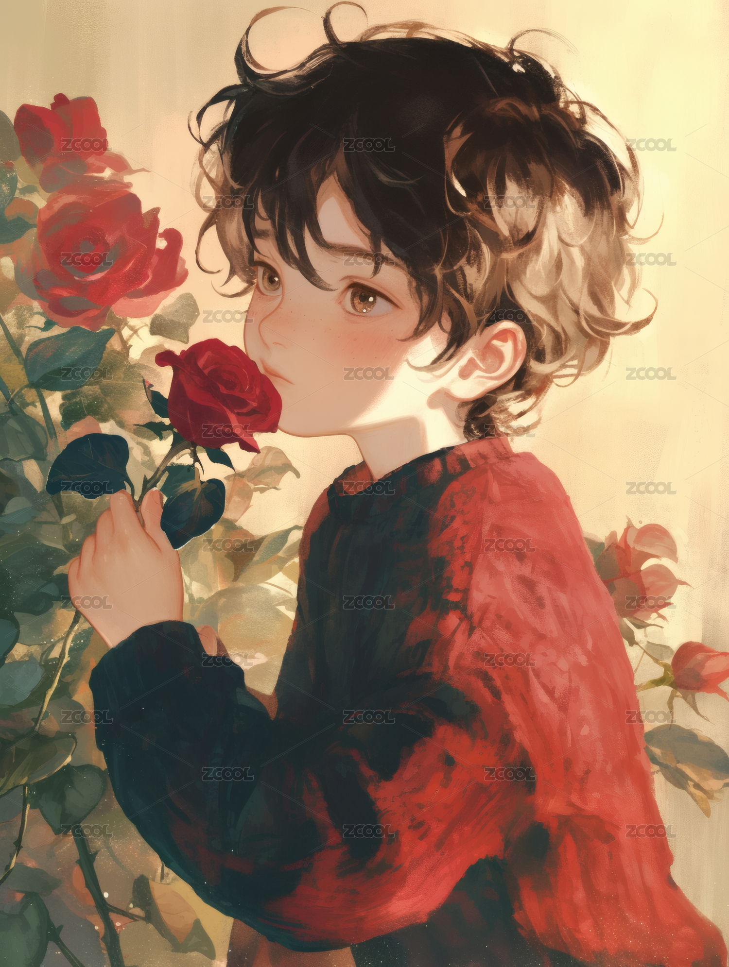 拿着玫瑰花的男孩