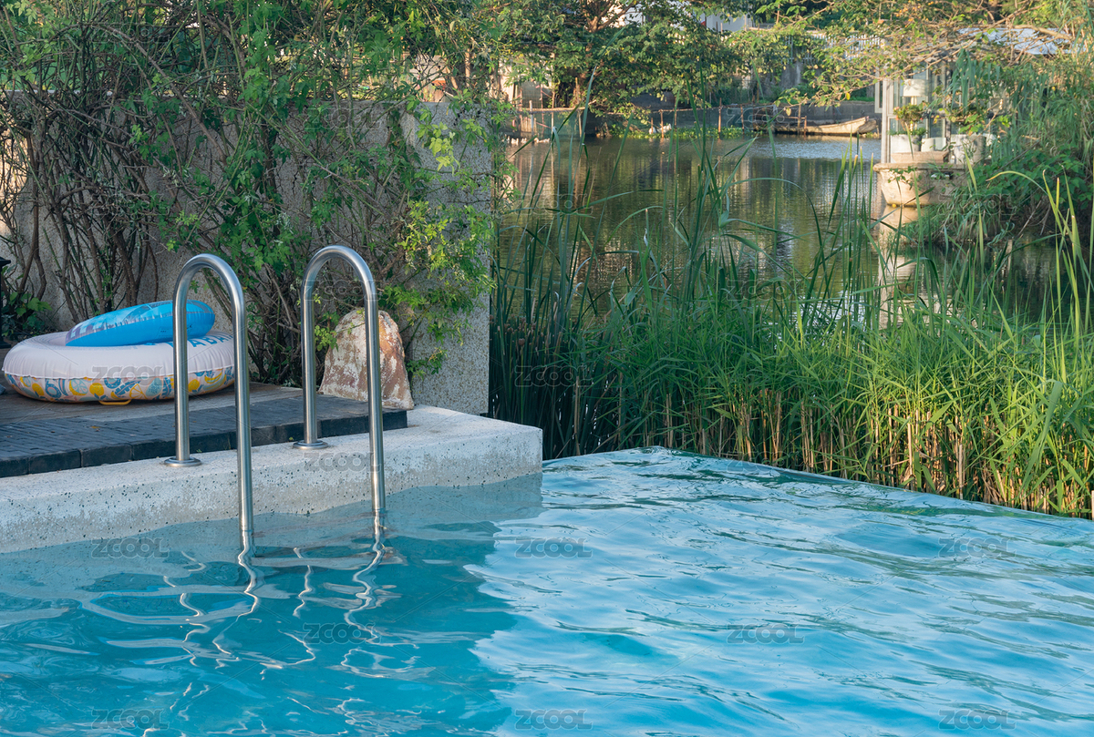 夏季开放的泳池楼梯扶手和蓝色的池水