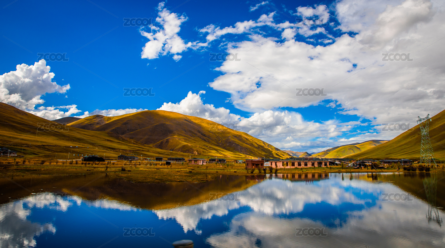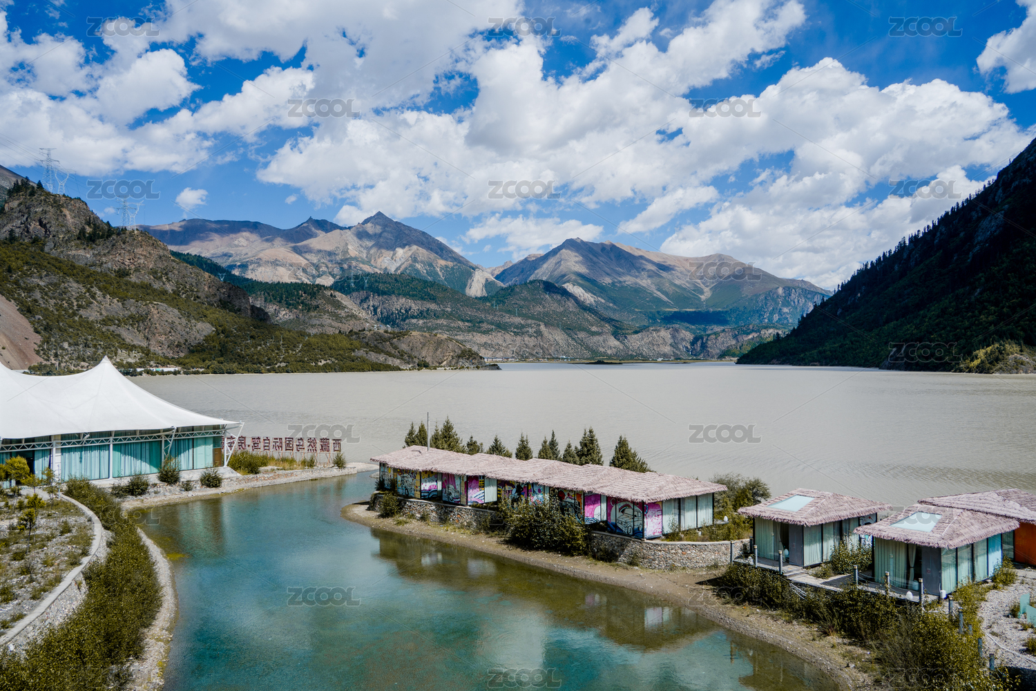 天空,湖泊,山,雪山,风景优美,倒影,湖面,藏寨,藏区,建筑