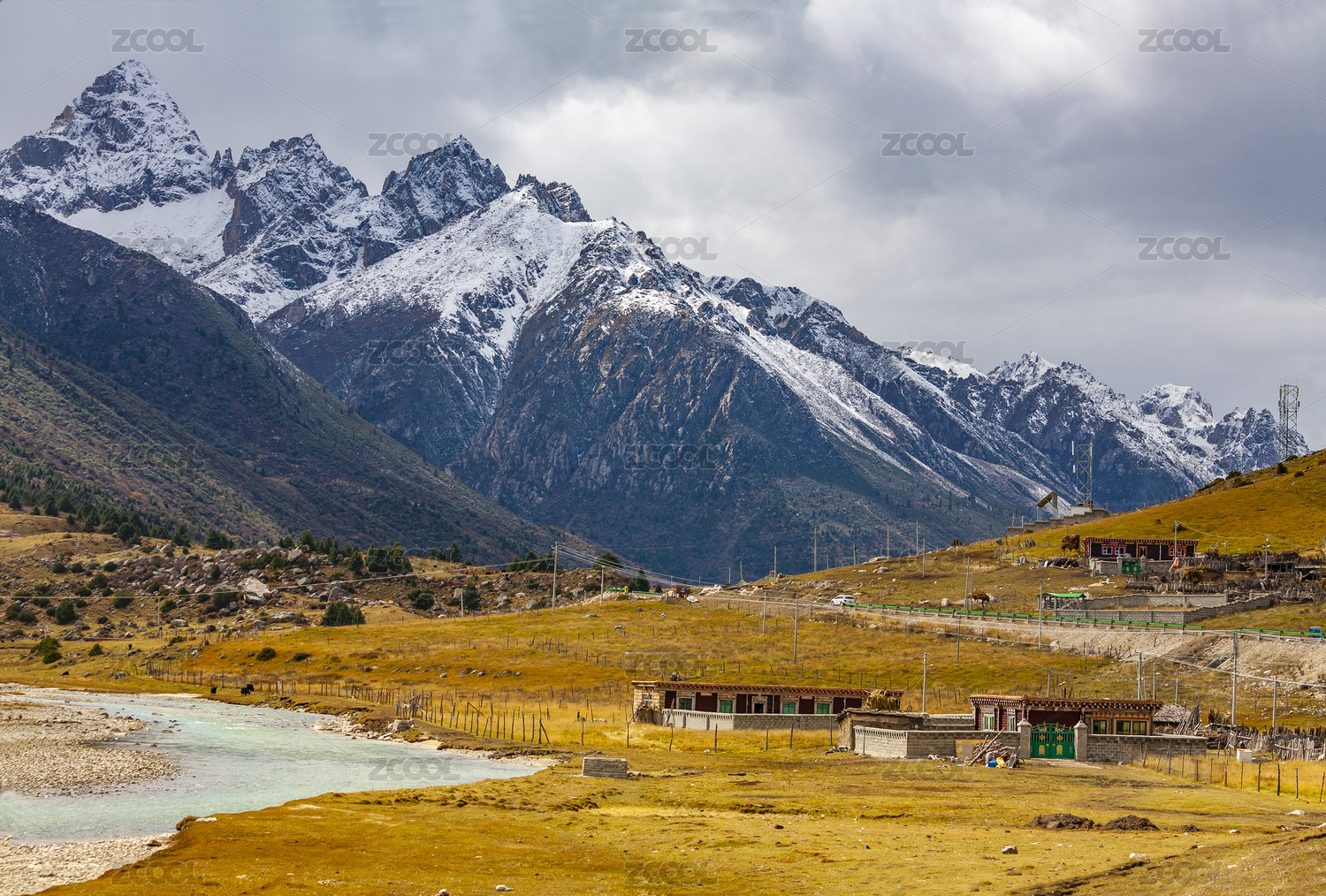 中国西藏当雄县念青唐古拉山下的藏式建筑