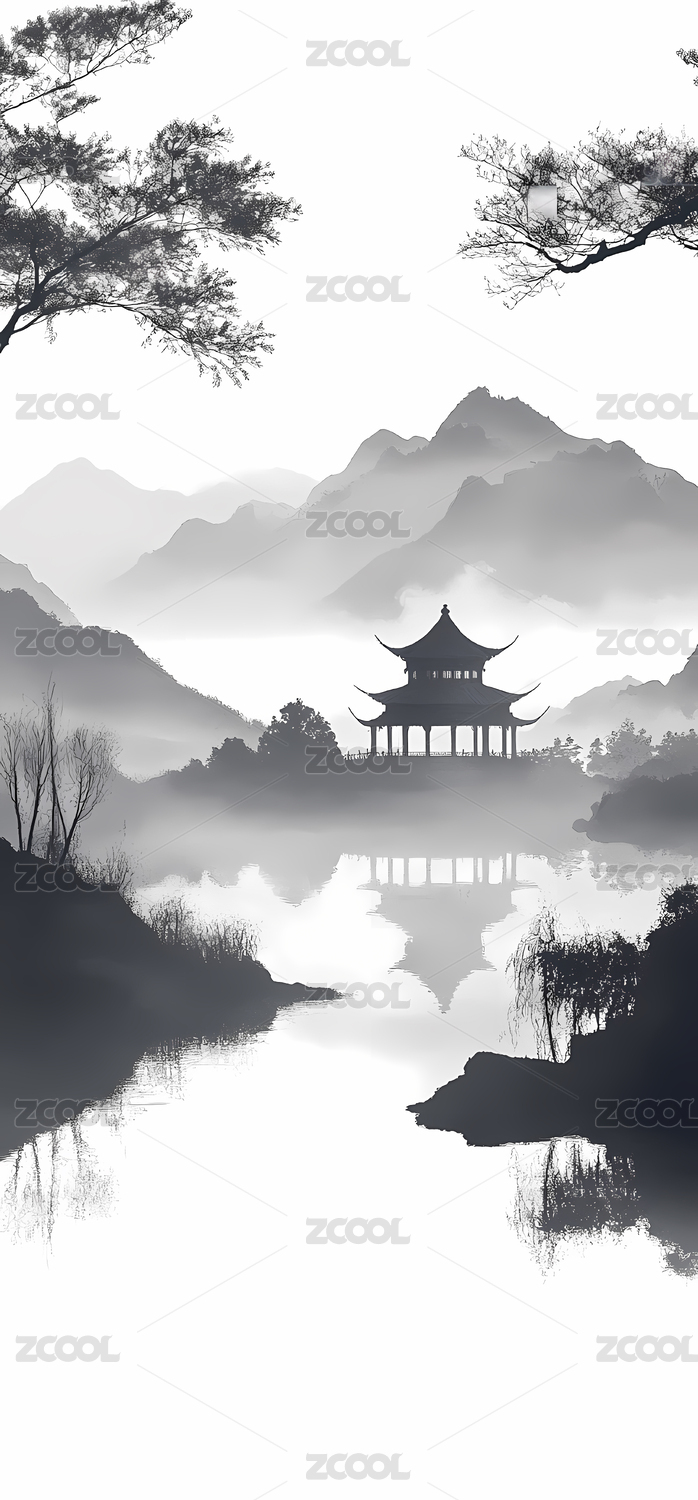 新中式风格水墨山水风景插画