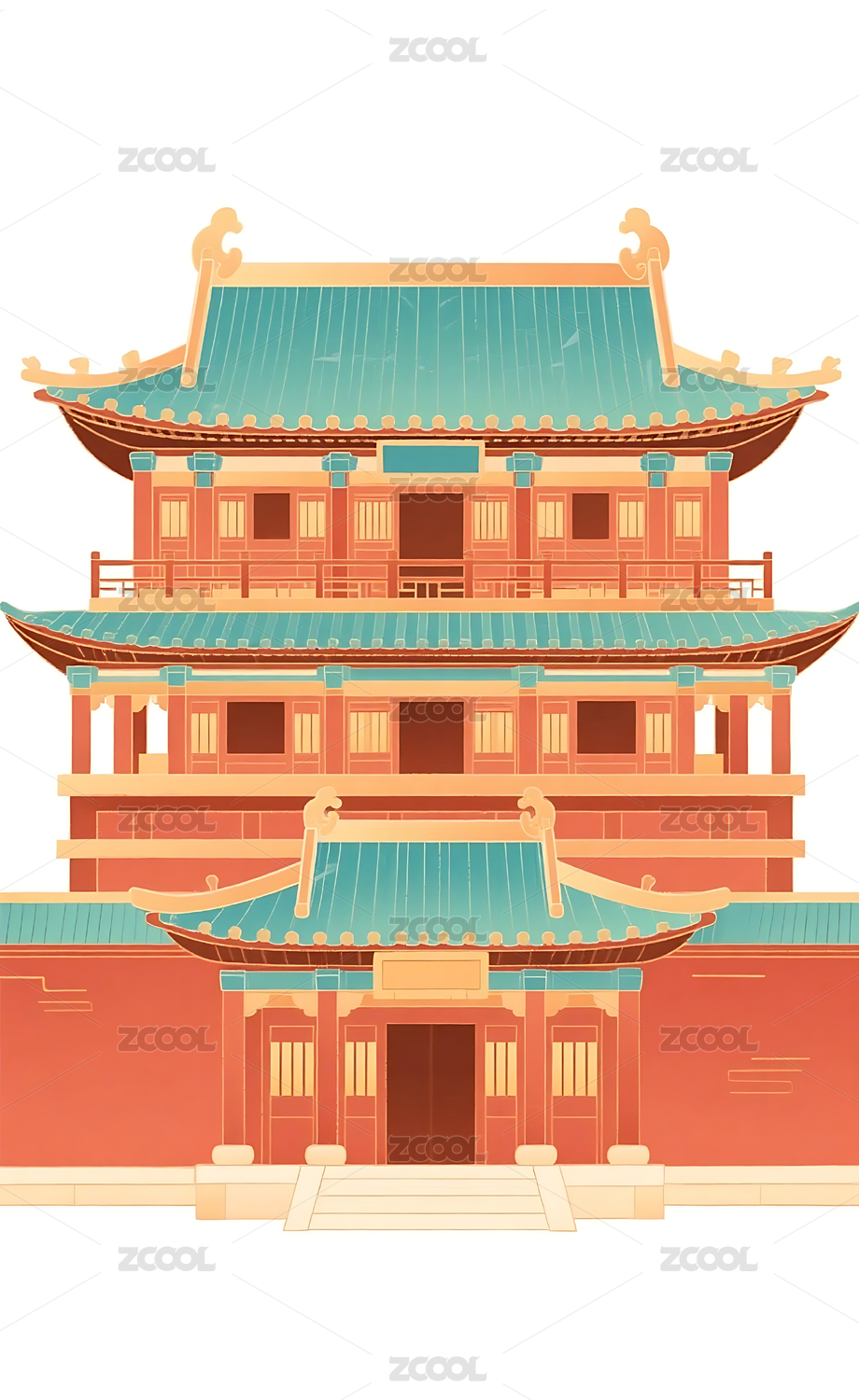 国潮风格中式传统古建筑插画素材
