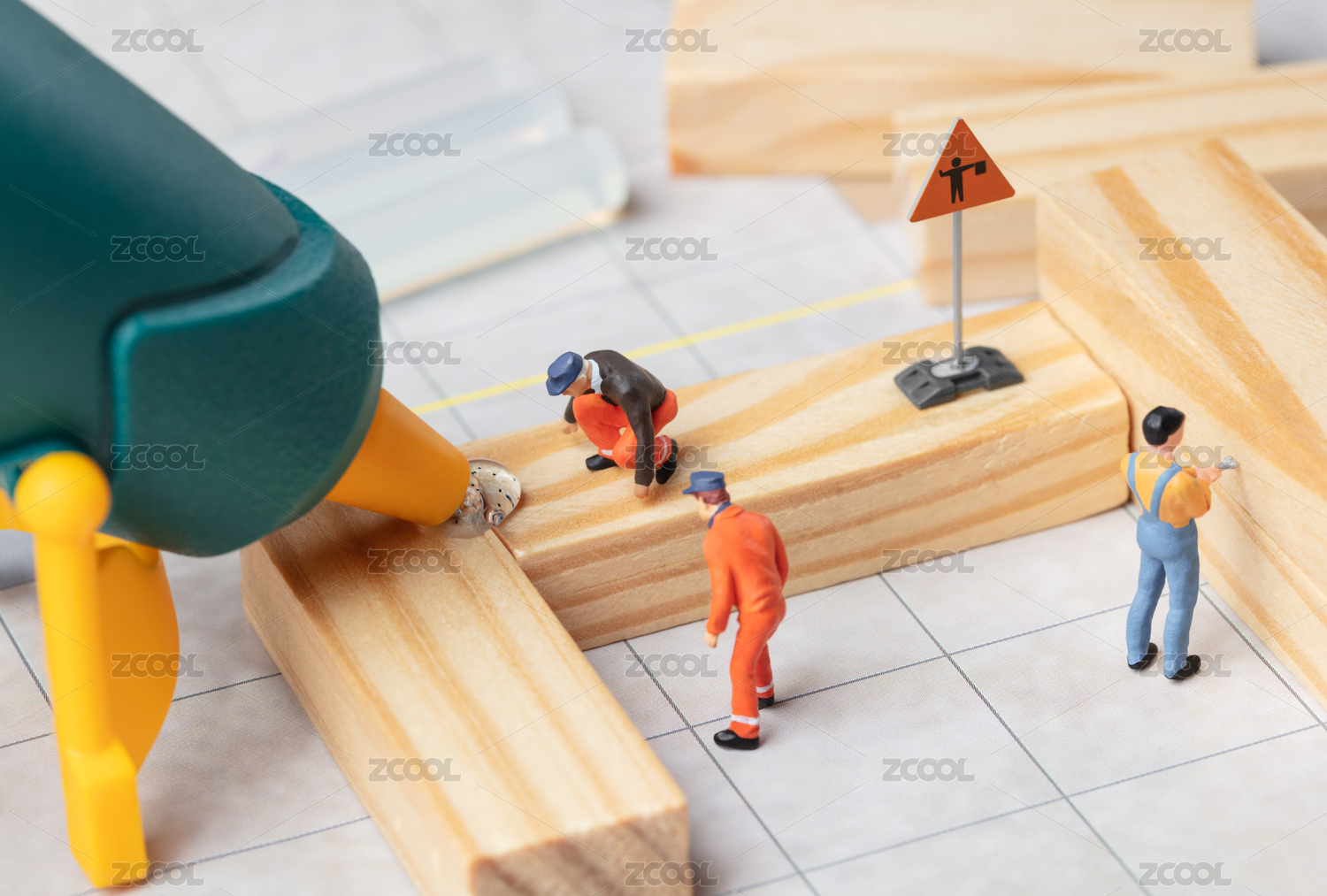 手工迷你场景工人使用热熔胶棒粘合木材