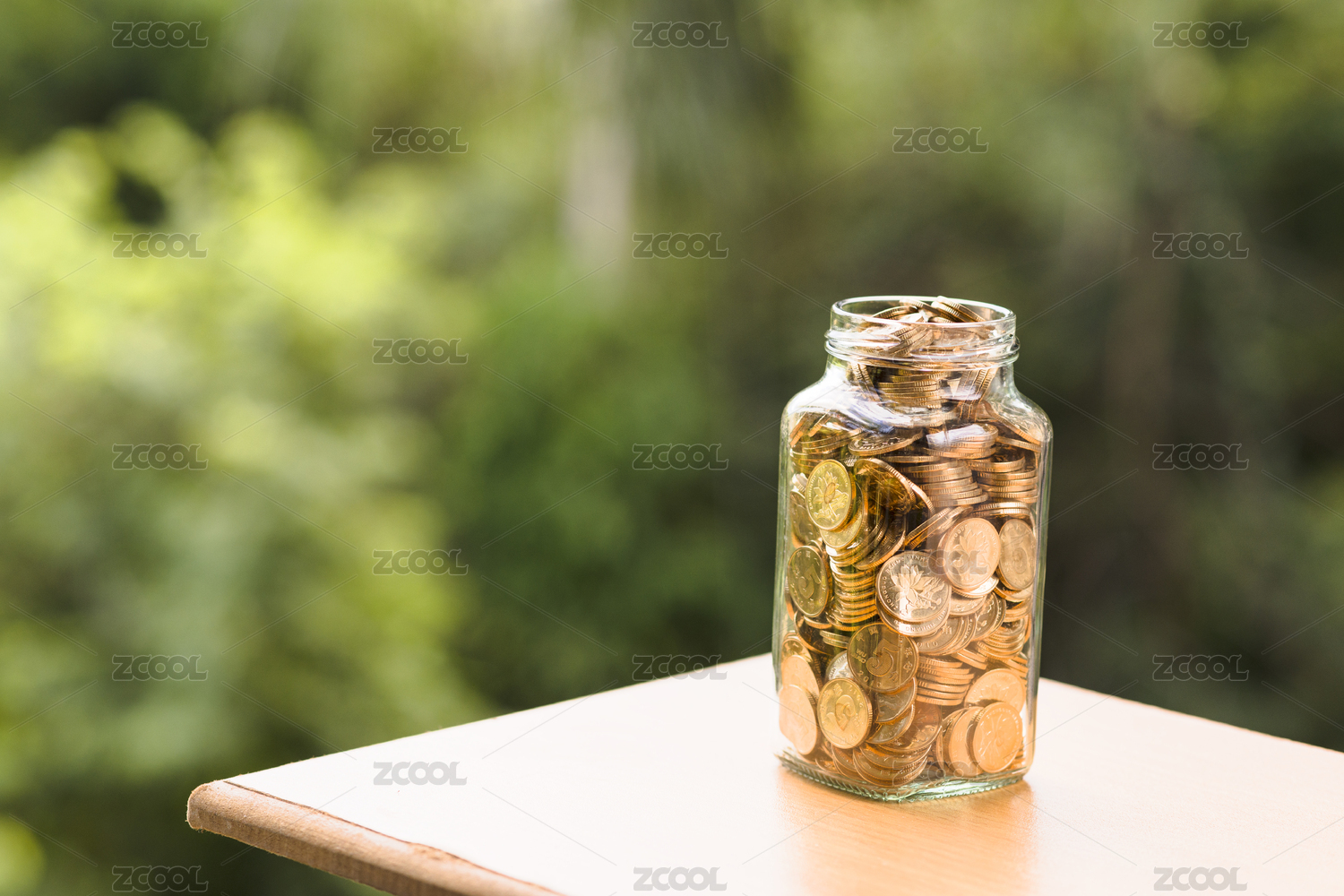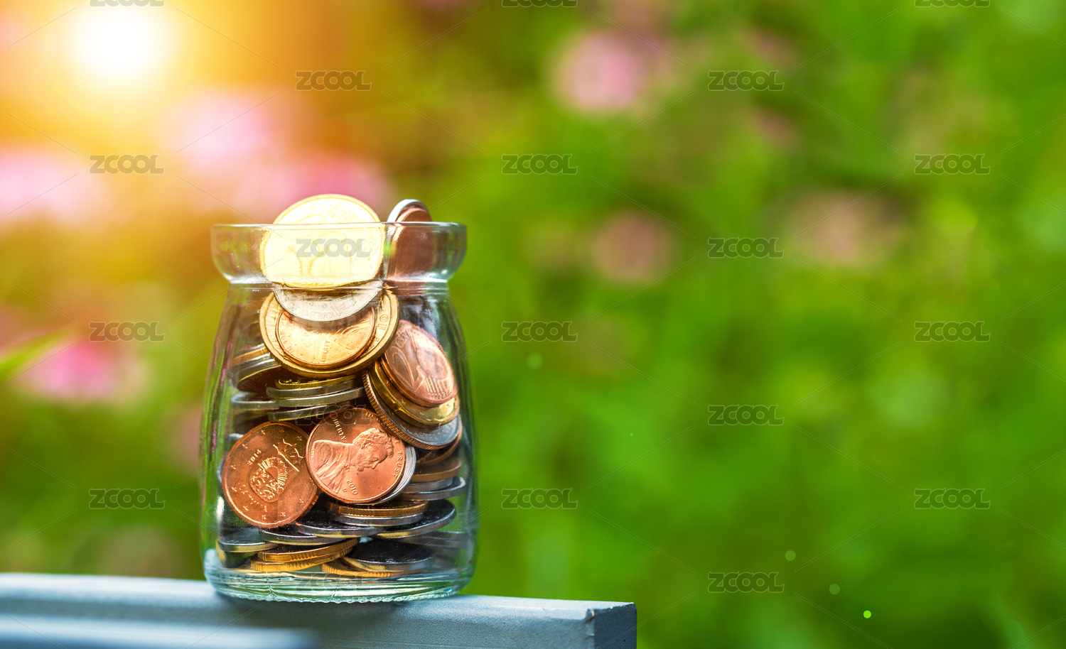 储蓄概念图像。 玻璃瓶中的硬币和自然背景