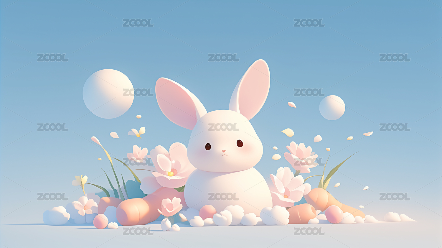 可爱的兔子在鲜花盛开彩蛋遍地的田野里