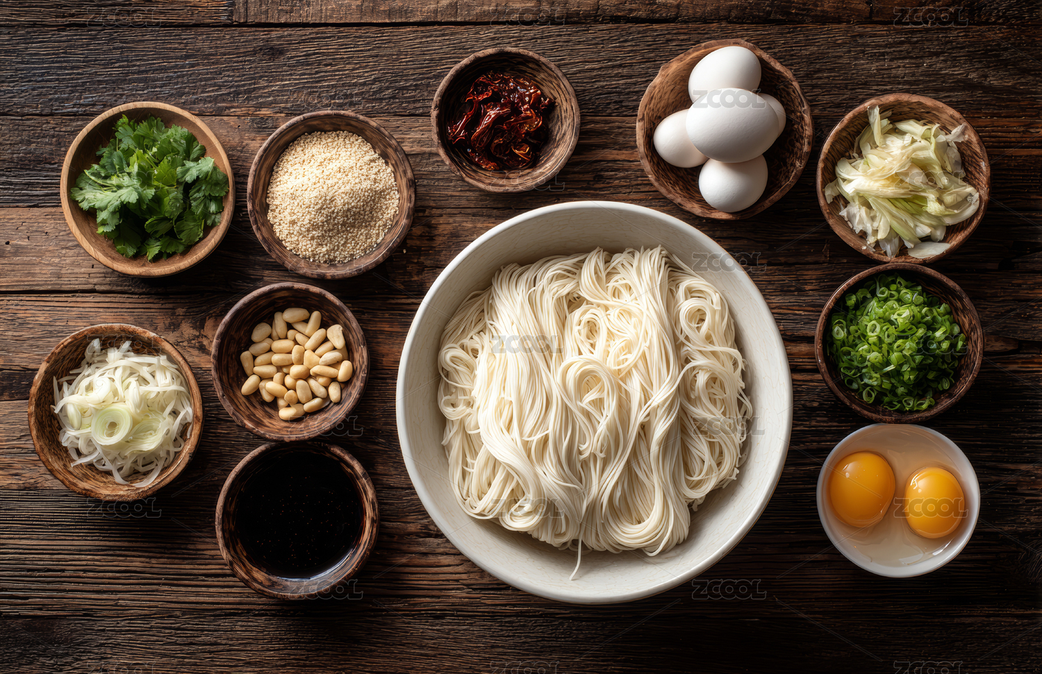木头桌子上的中国传统面食炸酱面