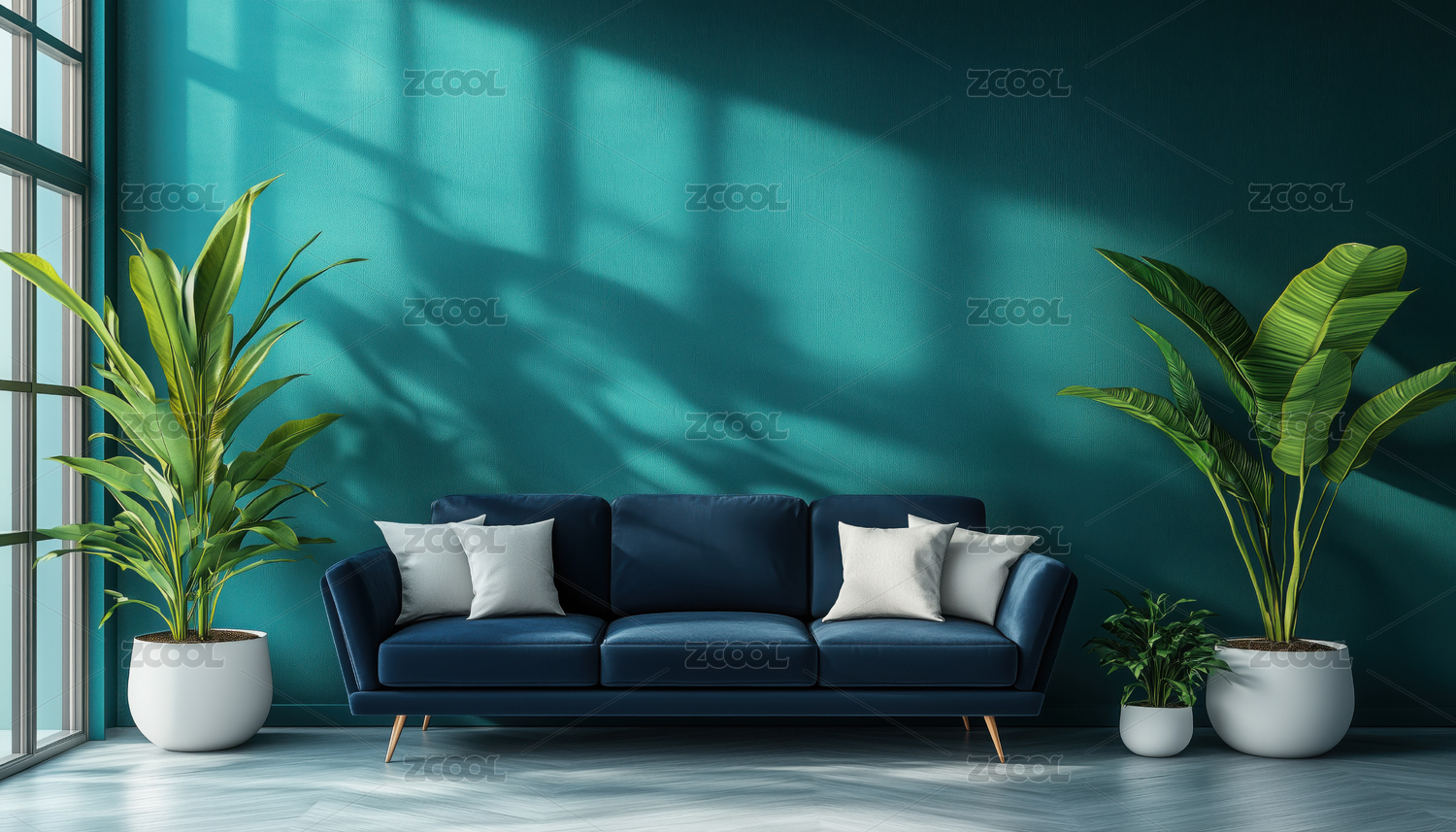 蓝色客厅沙发与绿植