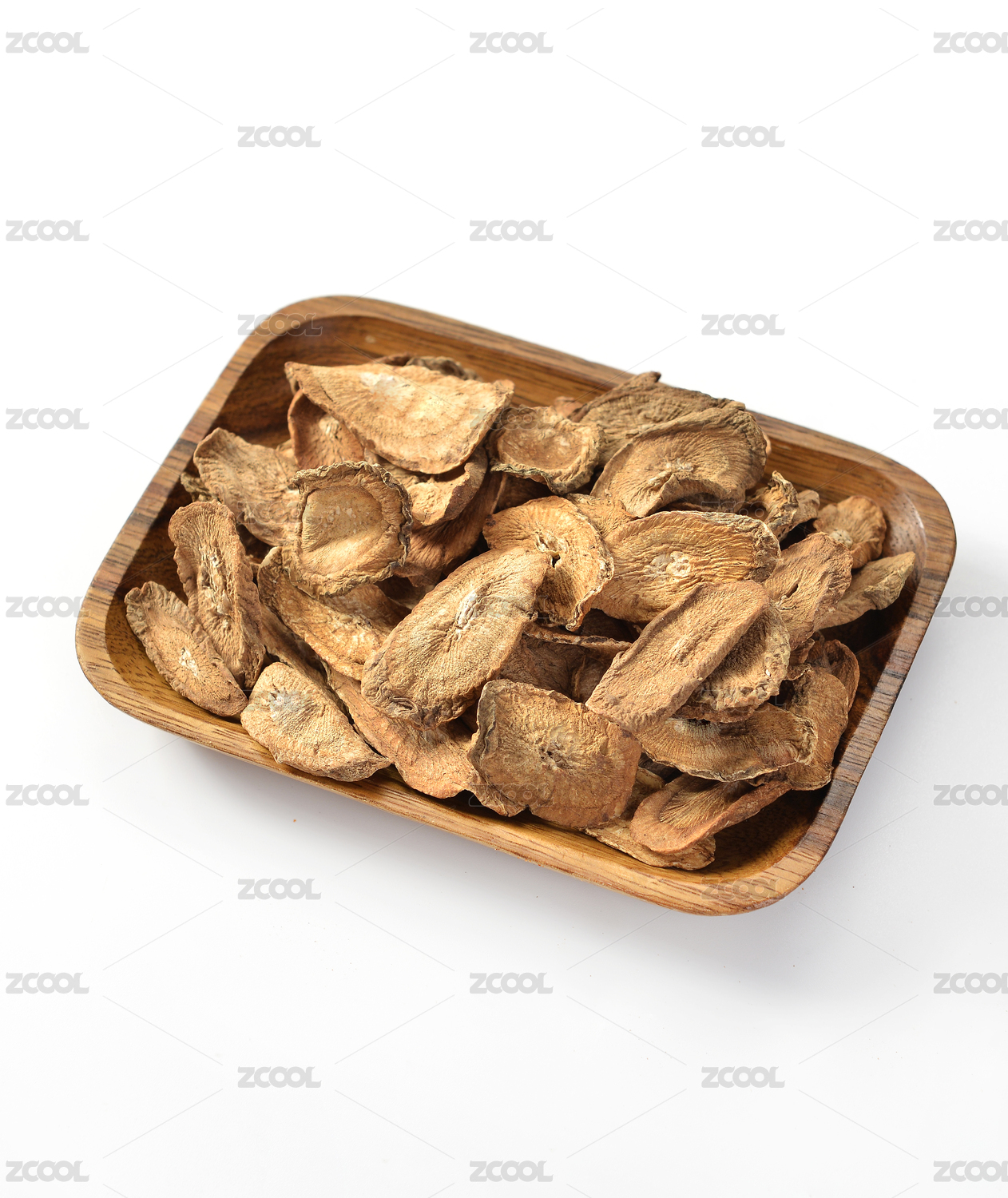 白背景上一碟中药材黄芪片