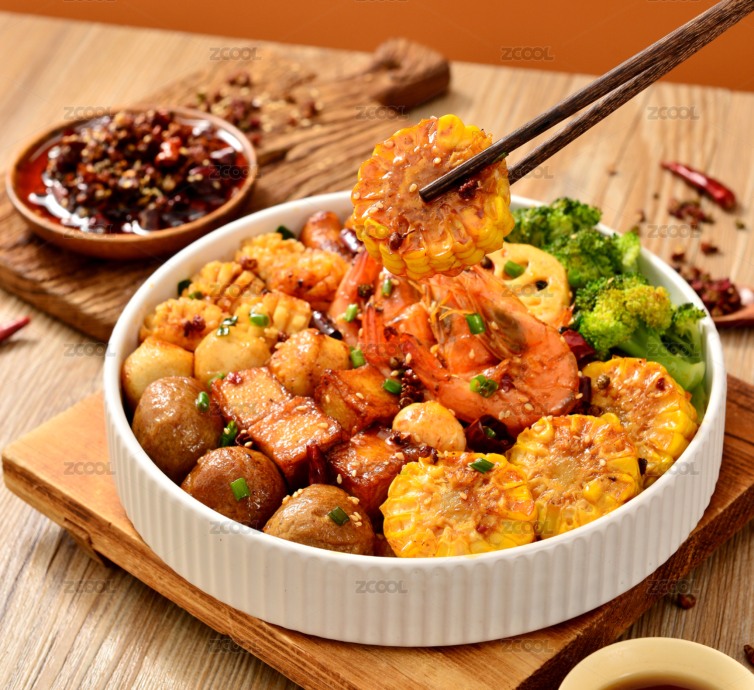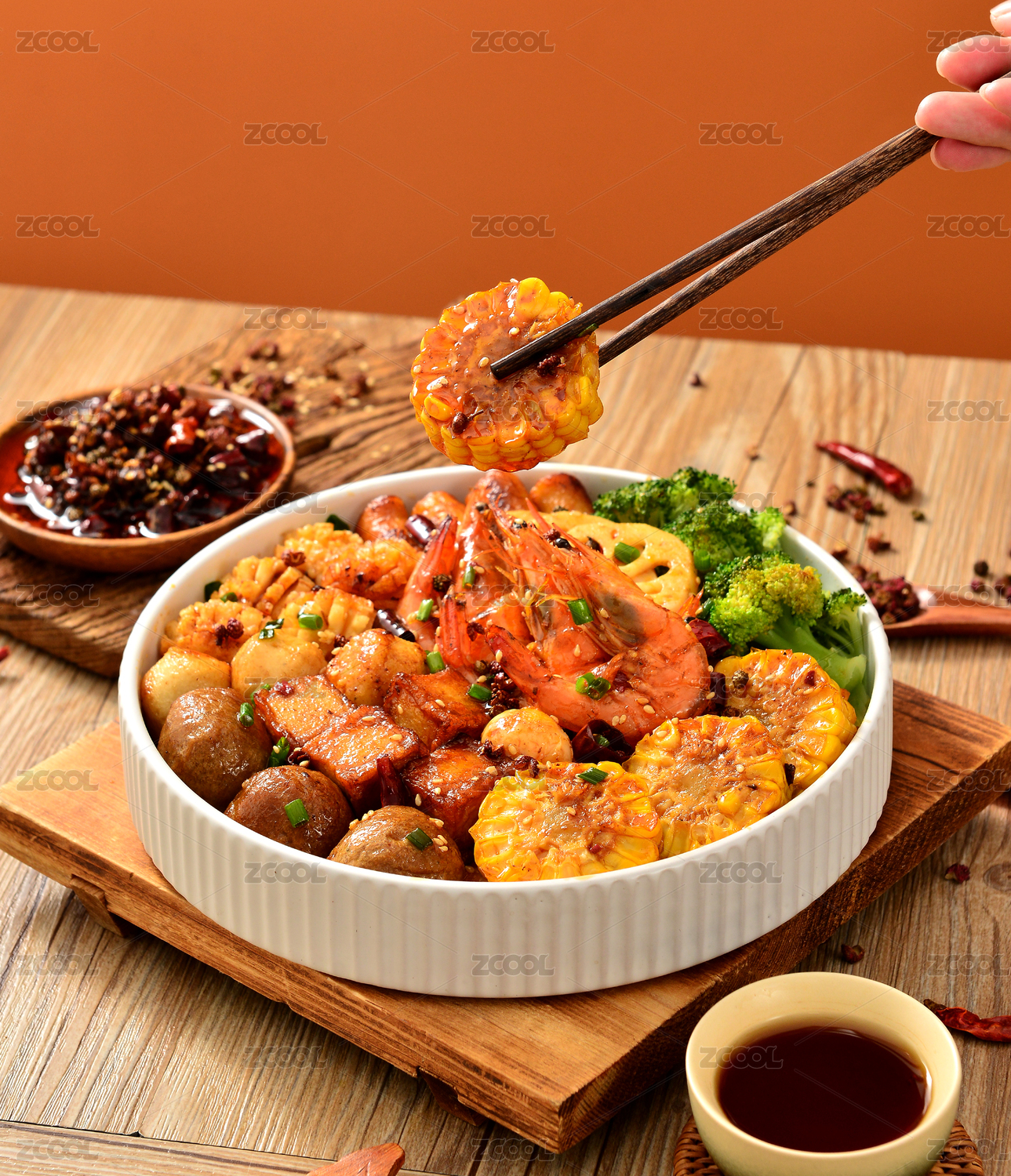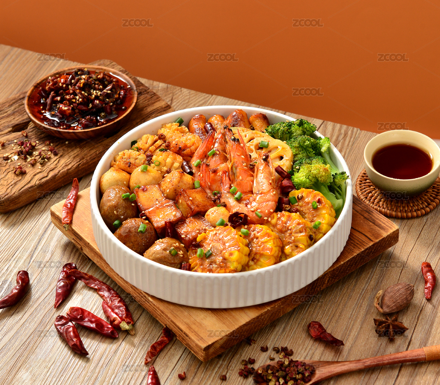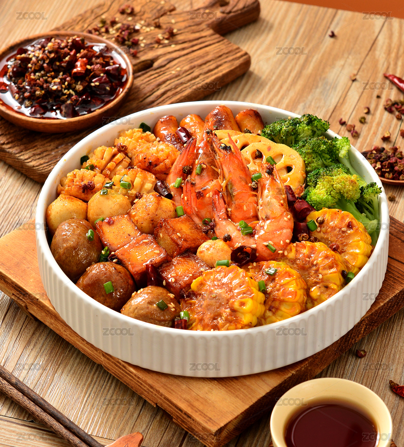 麻辣香锅,干锅冒菜,冒菜,红油冒菜,北极虾,西蓝花,鹌鹑蛋,鱿鱼花,海鲜,麻辣