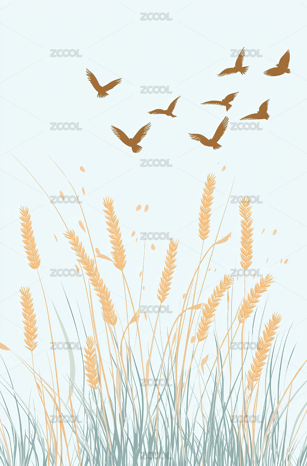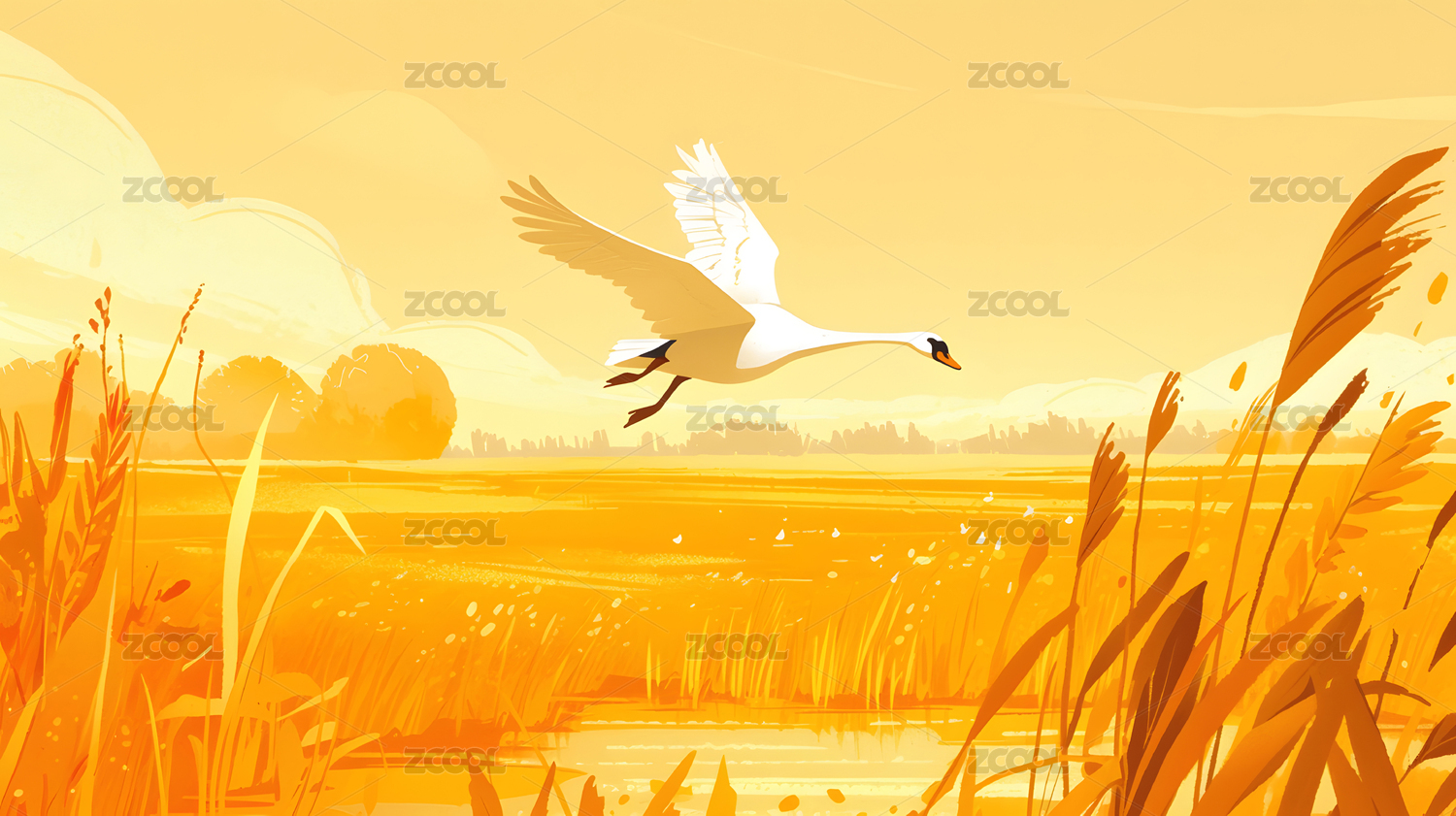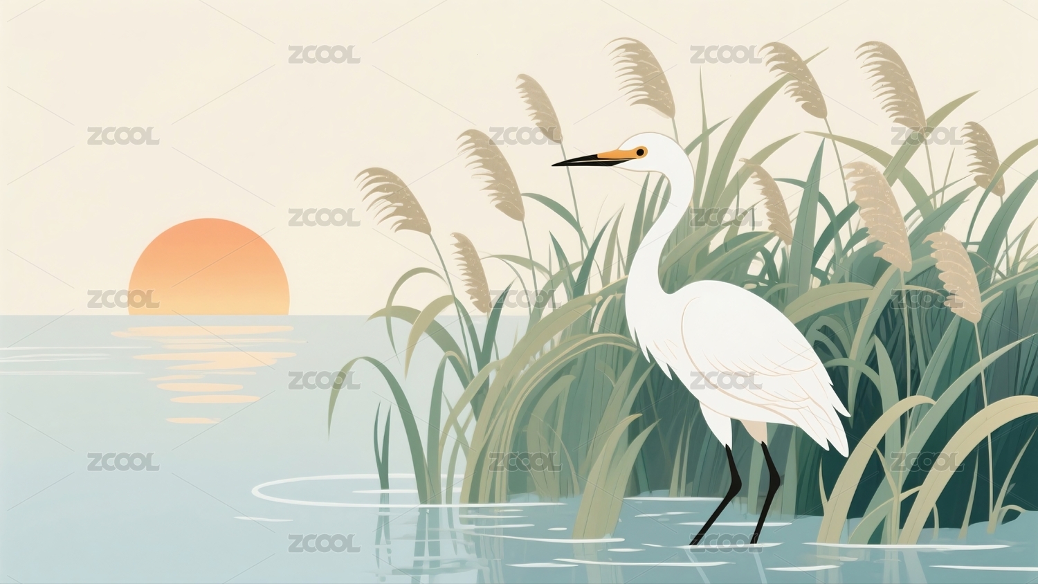 有露珠的叶子 山林芦苇地飞起的白鹭插画