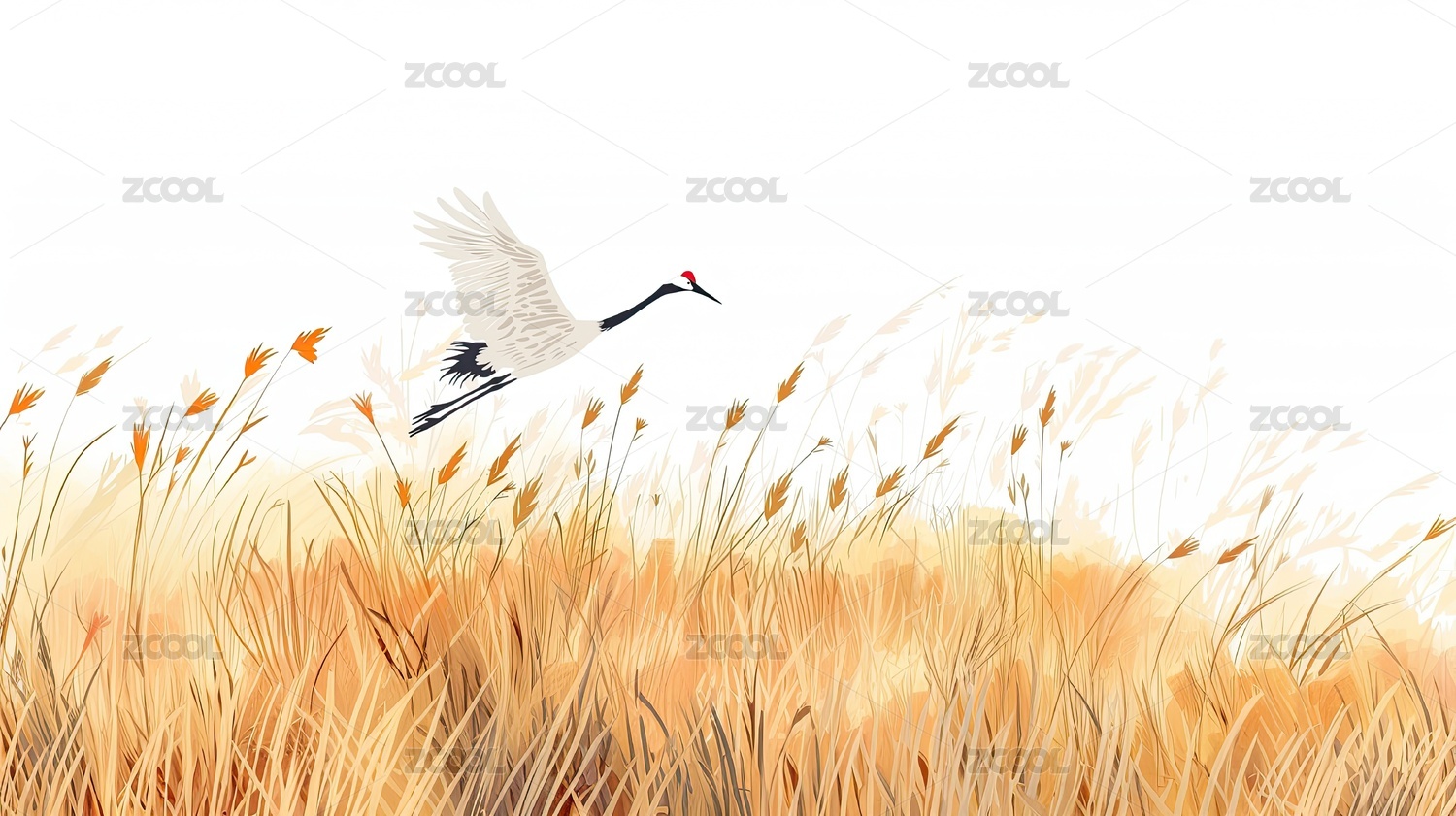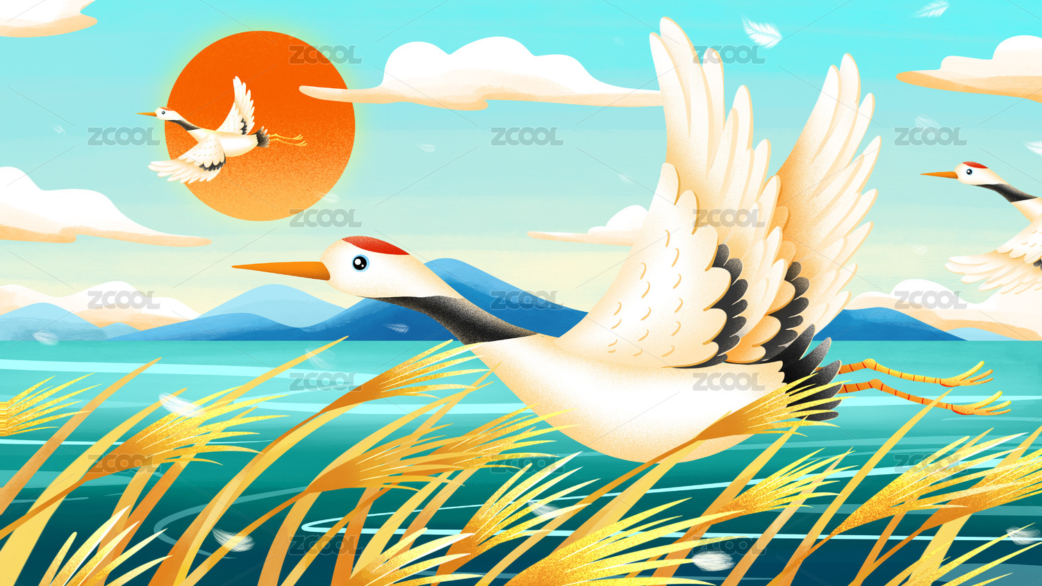 白露,立秋,秋天,丹顶鹤,白鹤,包装,背景,插画,高山,国潮