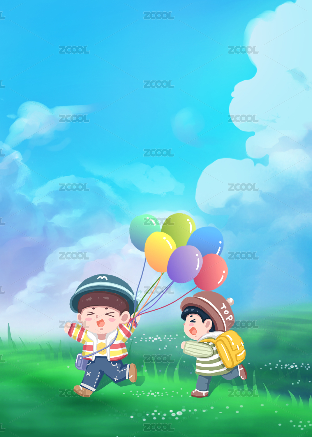 六一儿童节小孩玩气球插画快乐童年活动海报