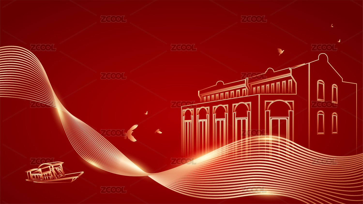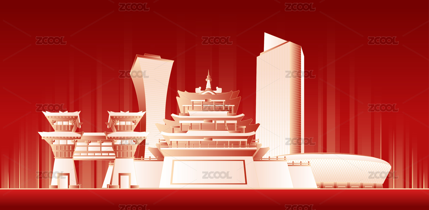 红色背景上的传统建筑剪影