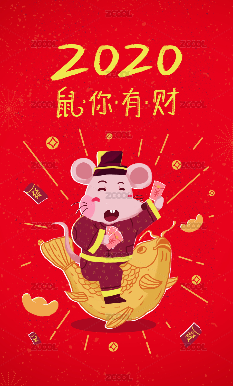 2020年鼠年新年插画老鼠拟人鼠你有财竖图