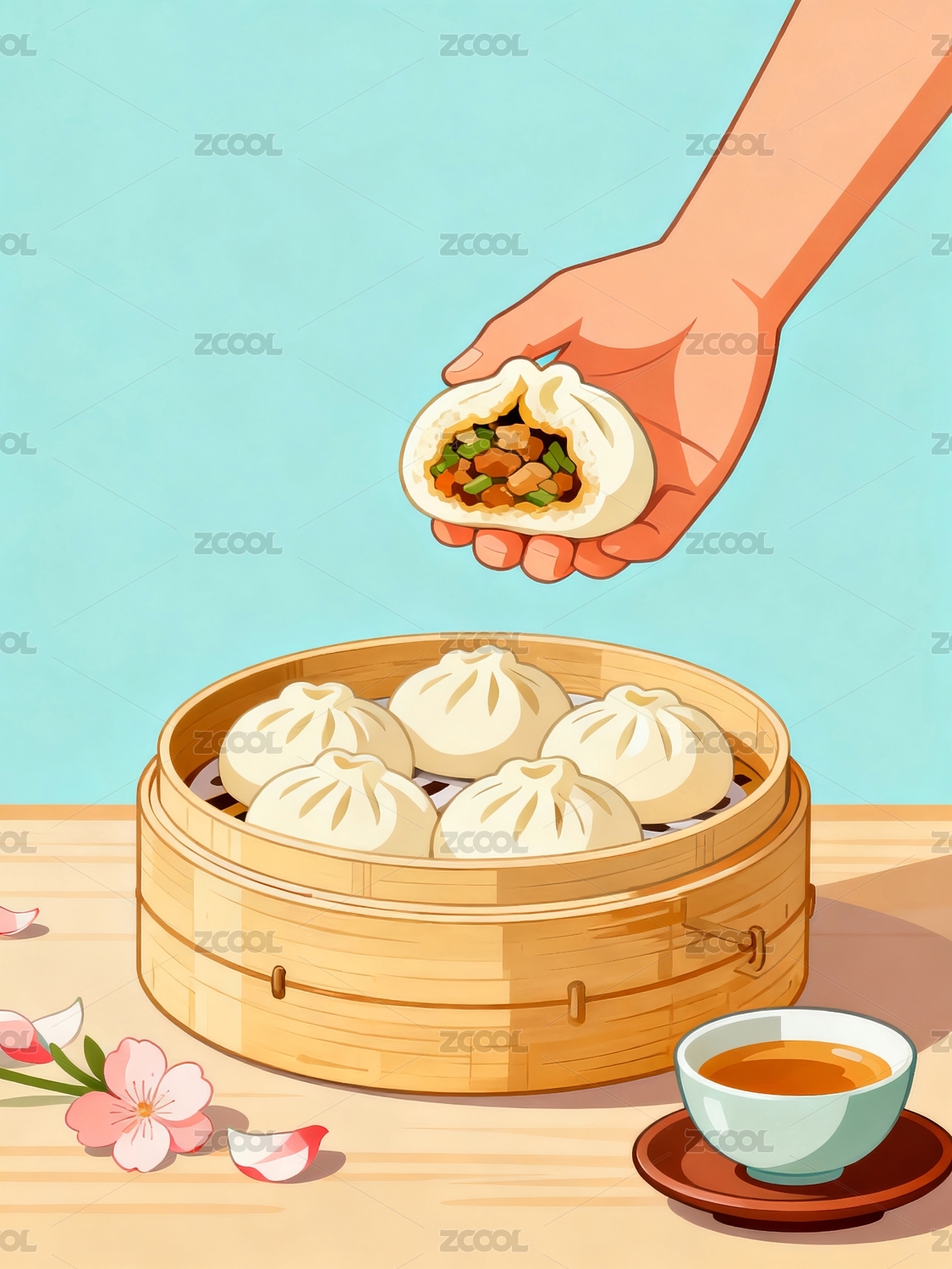 手拿包子茶杯竹笼
