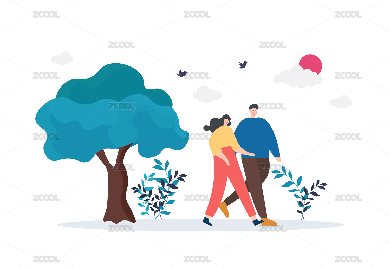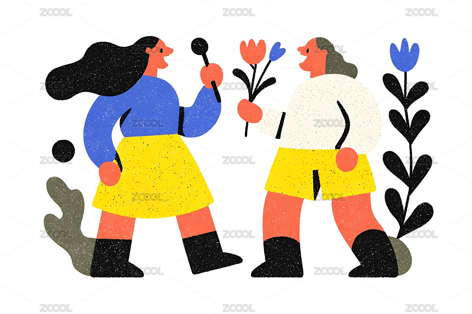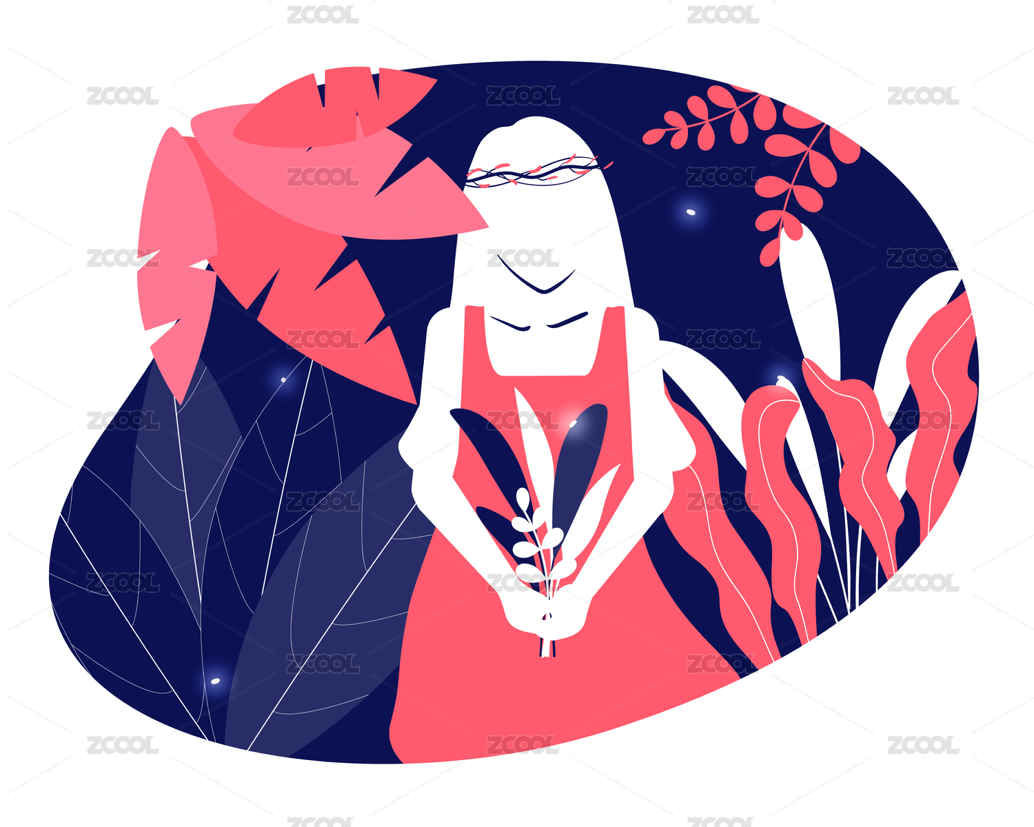 在花丛中彩色跳舞的女生矢量扁平化插图