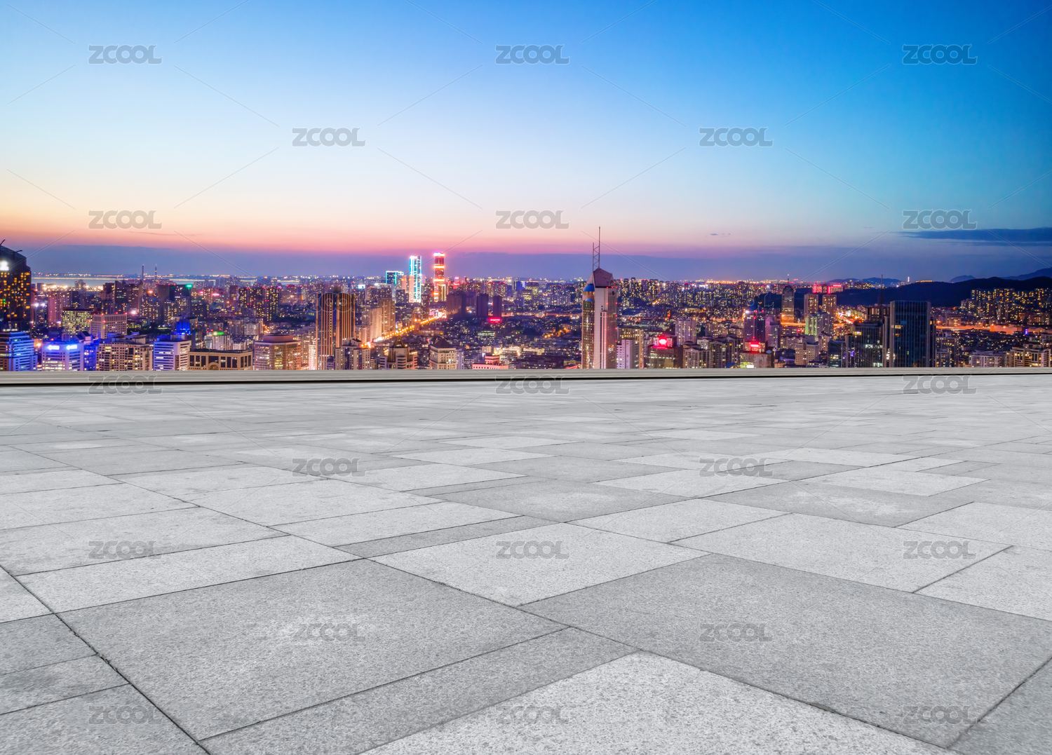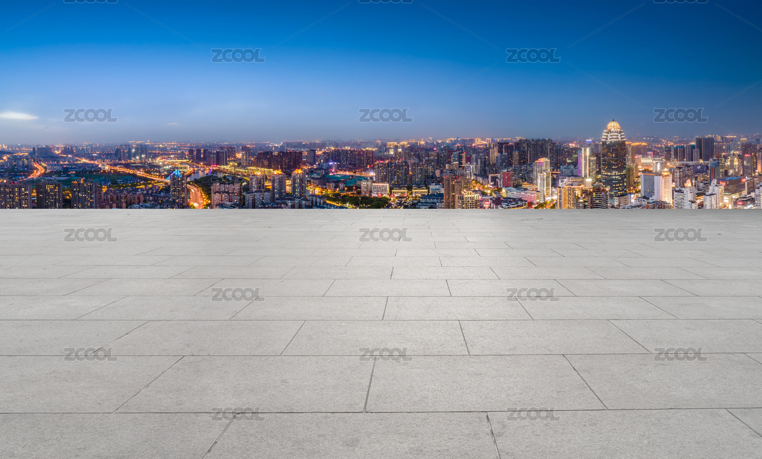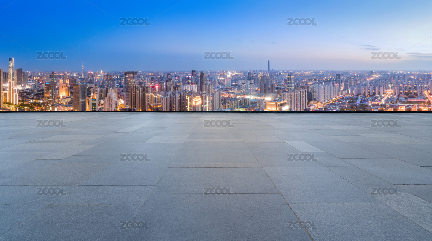 广场地砖和城市现代建筑群背景