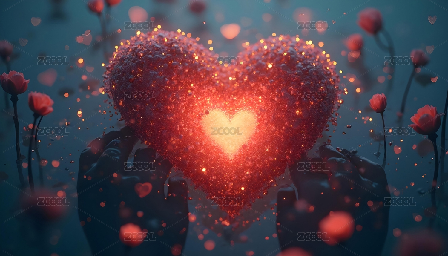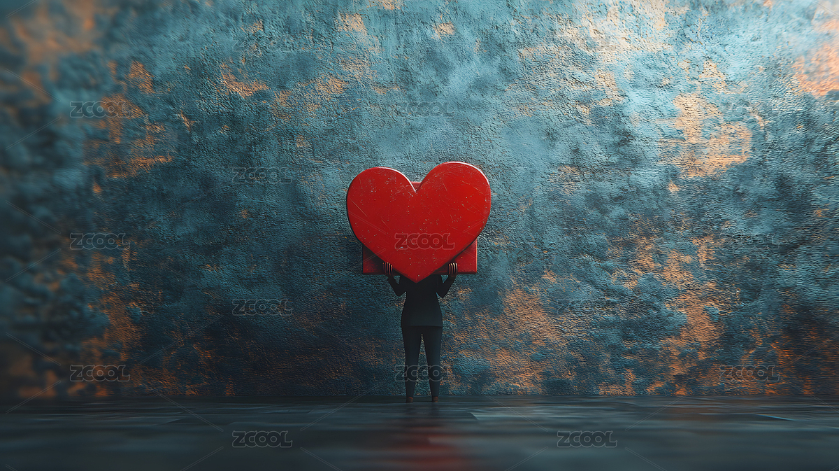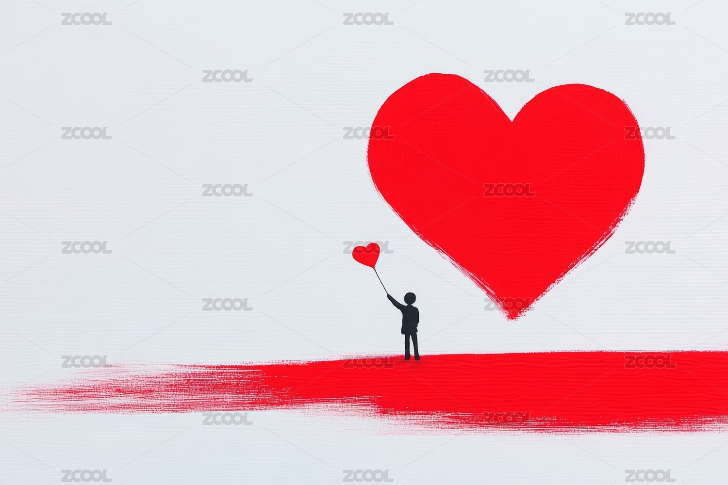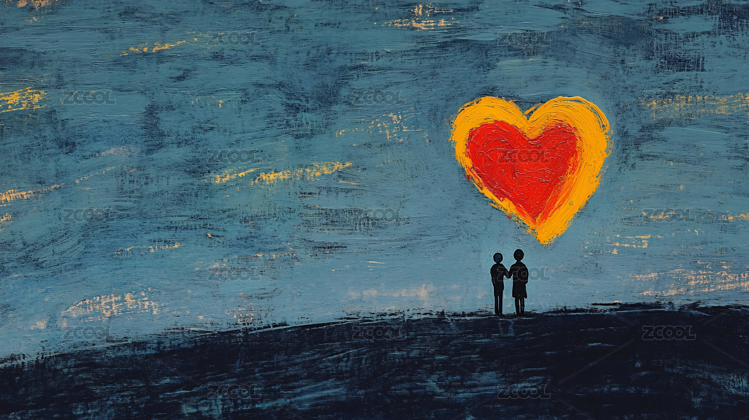 一对拥抱的情侣站在高处看着远处的爱心微缩