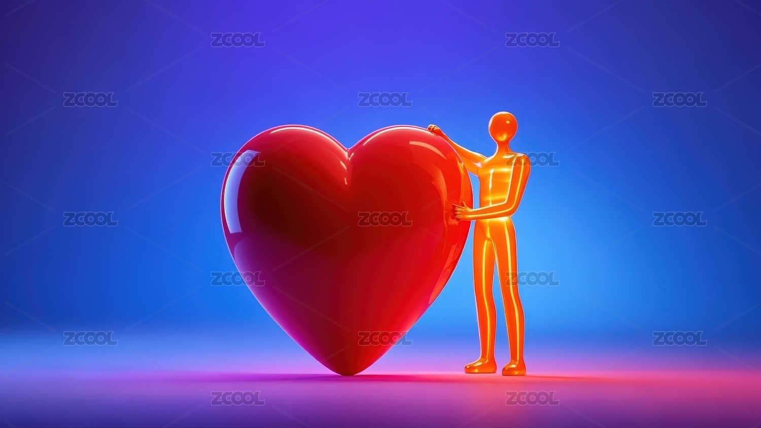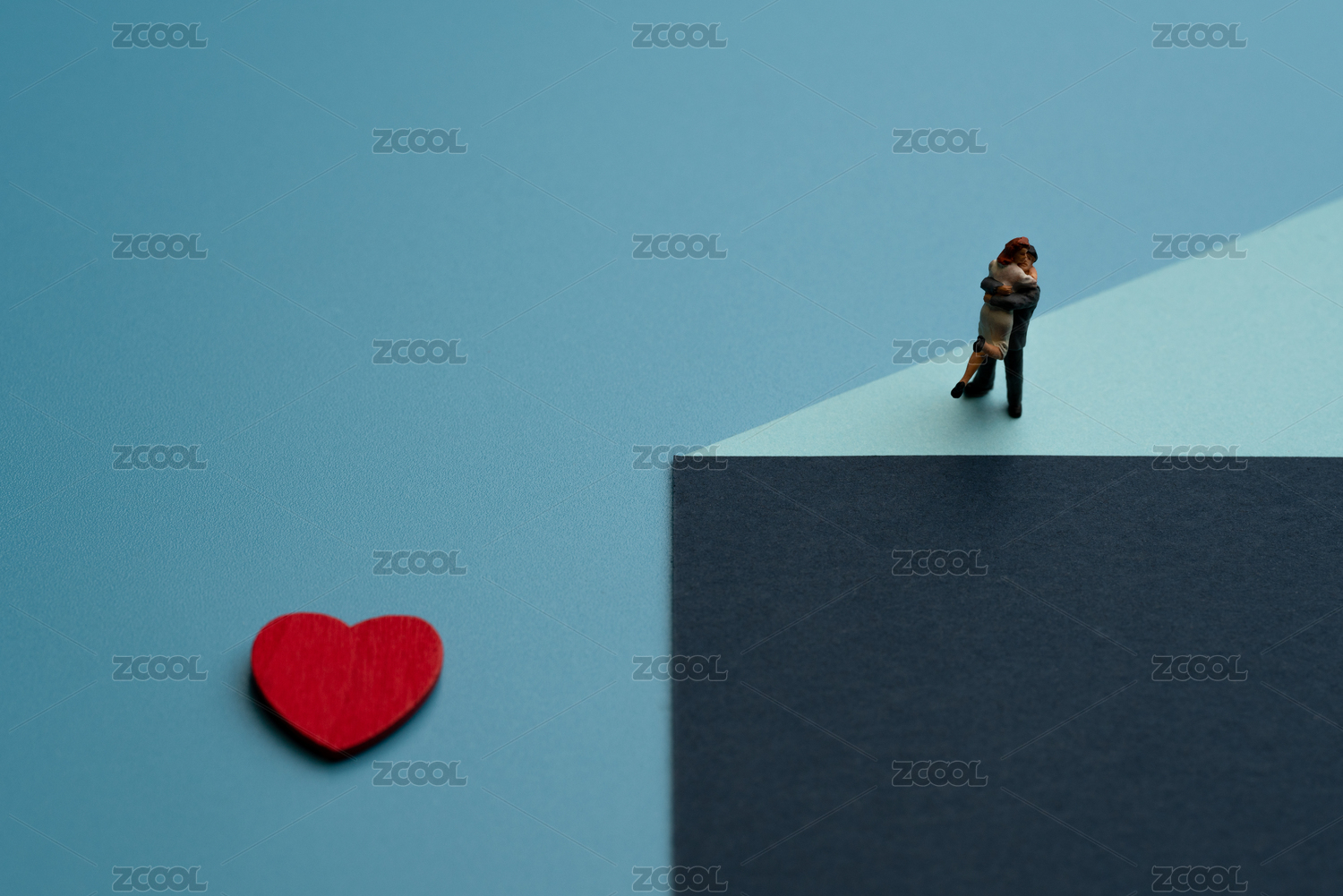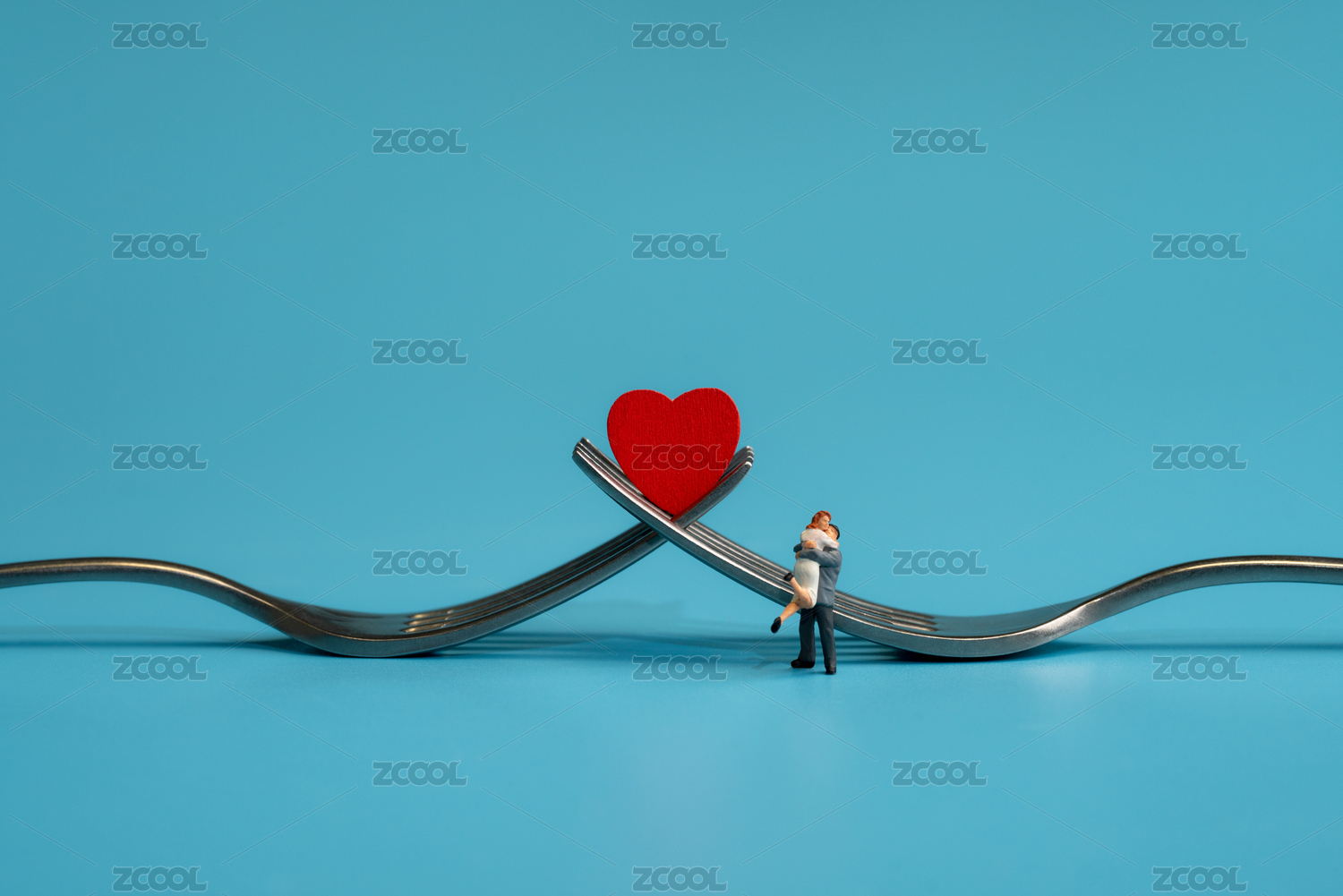 拥抱的恋人站在放在叉子上的爱心边微缩创意