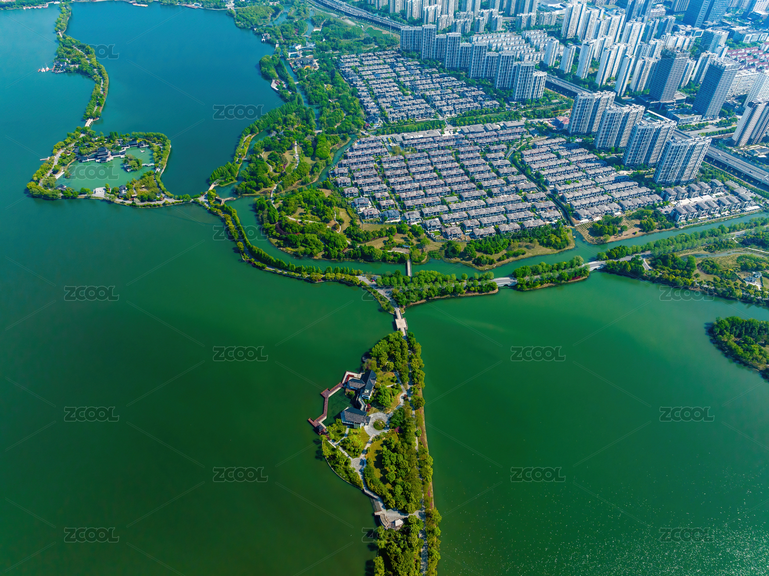 航拍苏州金鸡湖畔李公堤