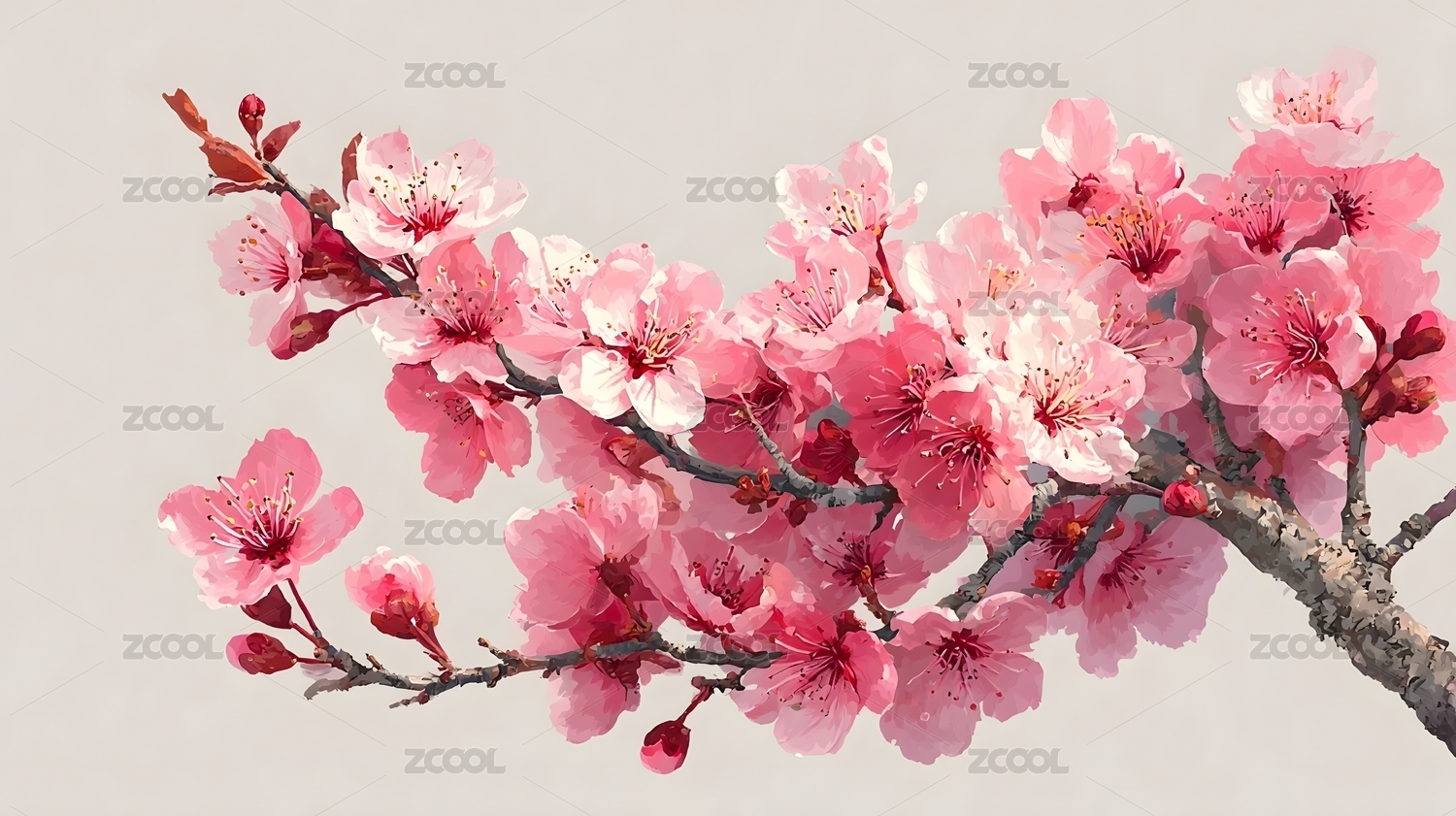 盛开的桃花花枝水墨风手绘水彩插画素材