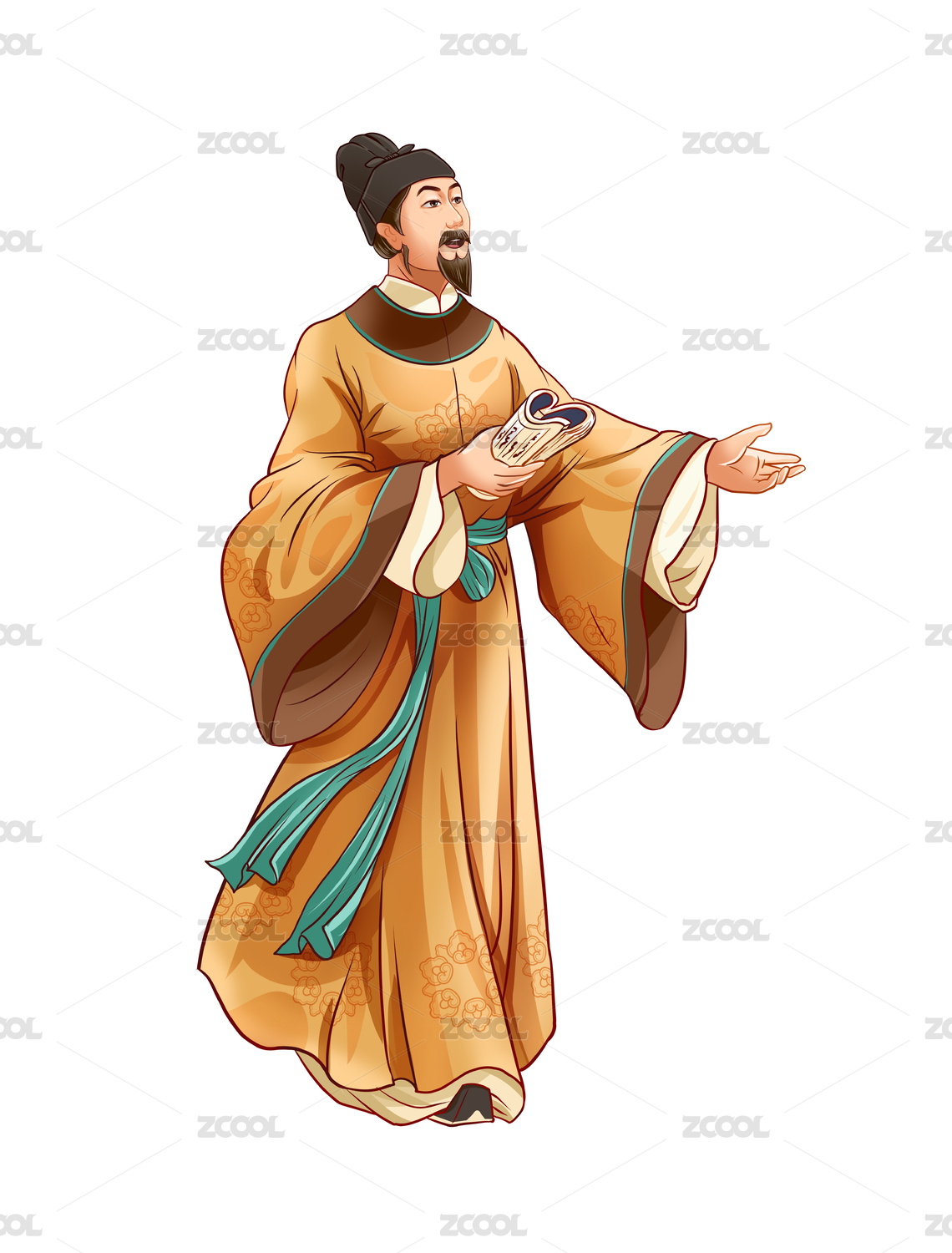 古代人物于谦手拿毛笔头载官帽,手绘插画