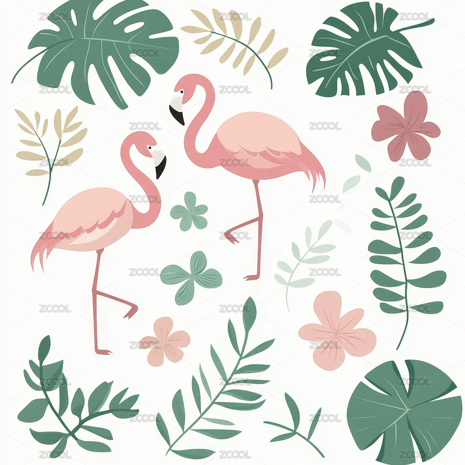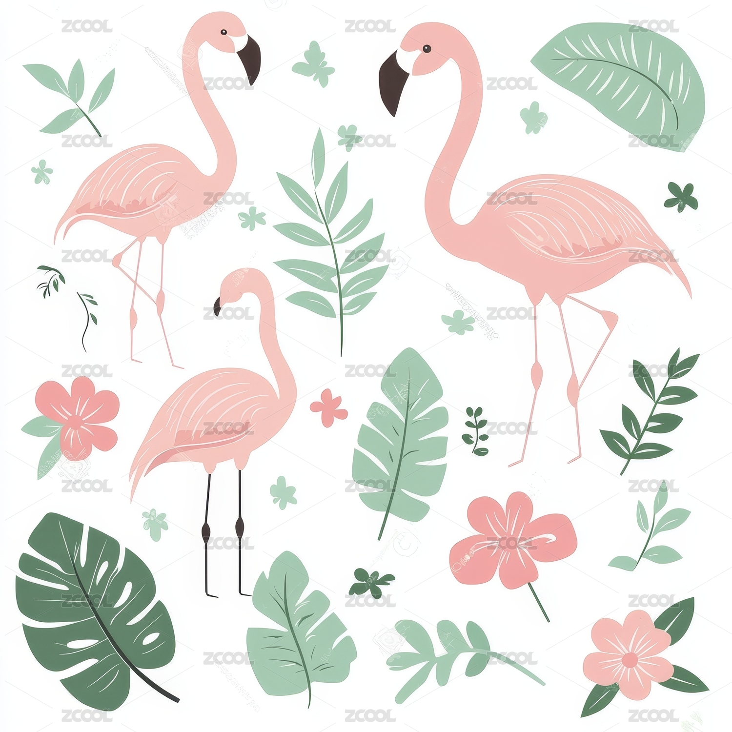 火烈鸟,热带,植物,风情,粉色,绿色,叶子,花朵,插画,矢量图