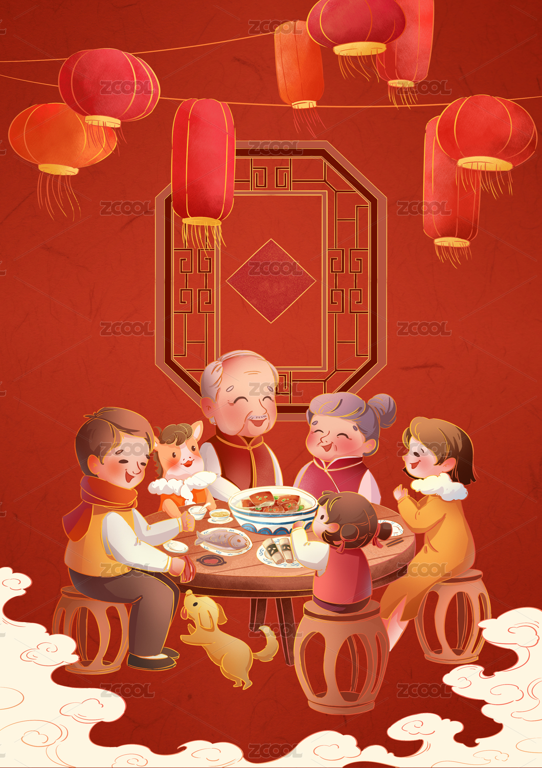 除夕夜一家人开开心聚在一起吃年夜饭国潮风