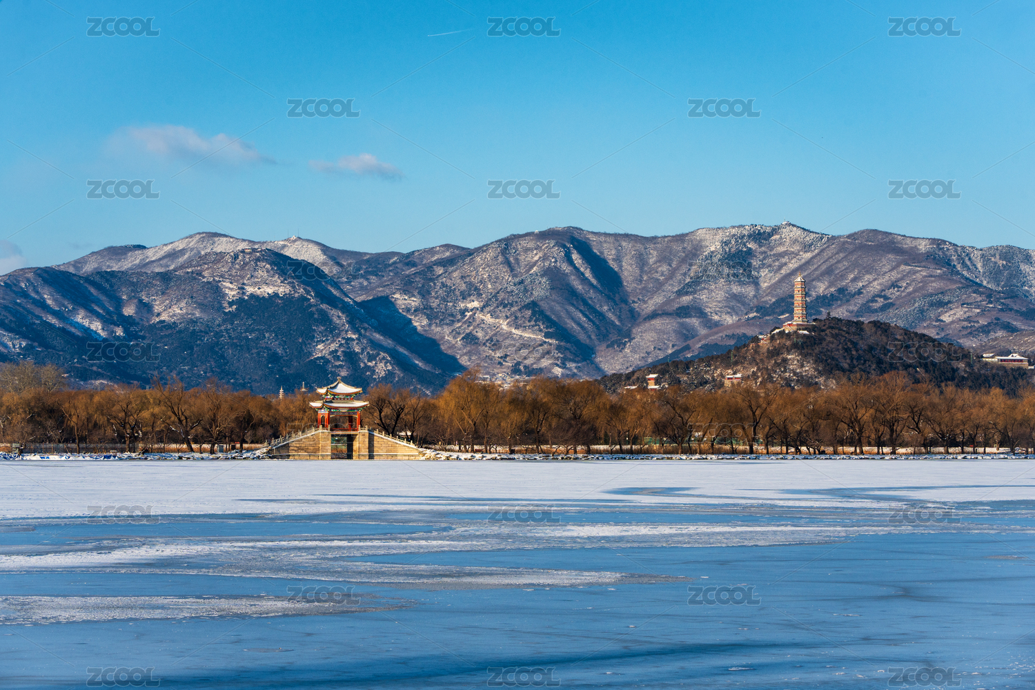 北京颐和园冬日结冰的昆明湖和白雪覆盖的万寿山