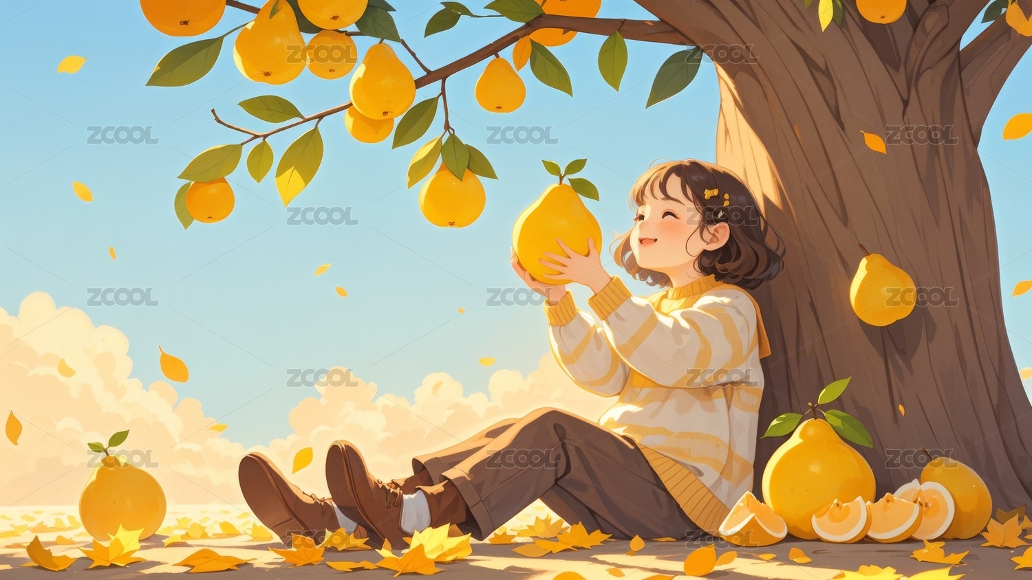 坐在柿子上摘柿子的女孩秋季节气矢量插画