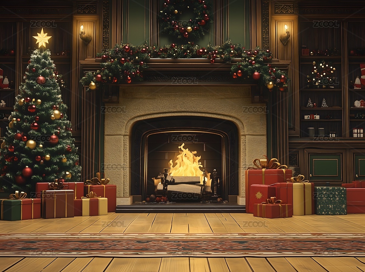 温馨圣诞夜小屋壁炉圣诞树礼物