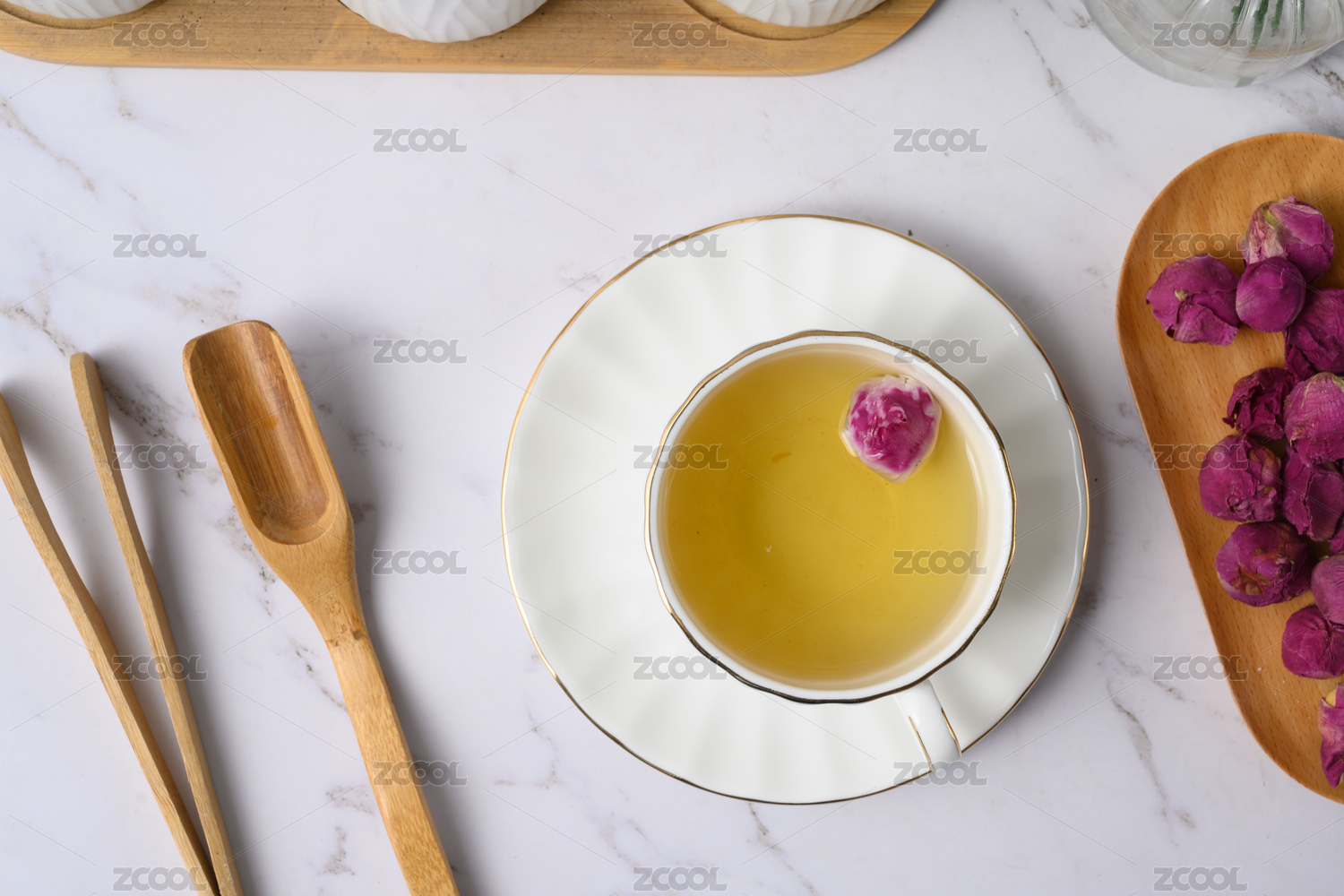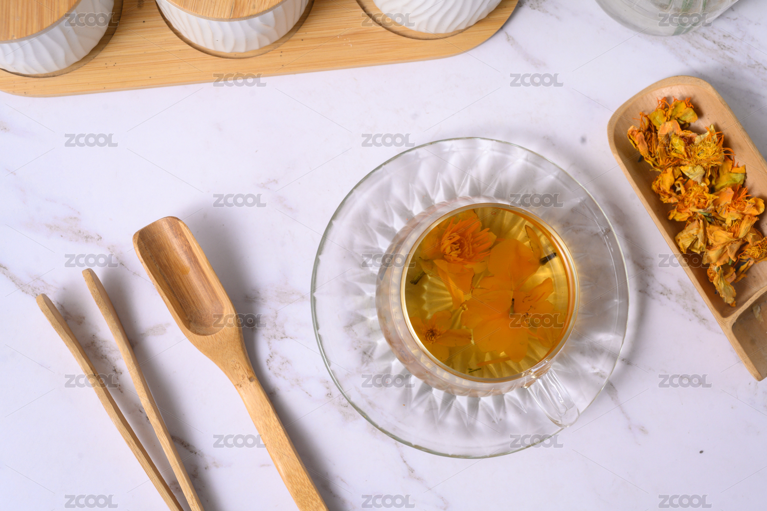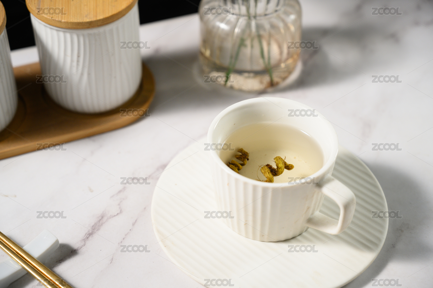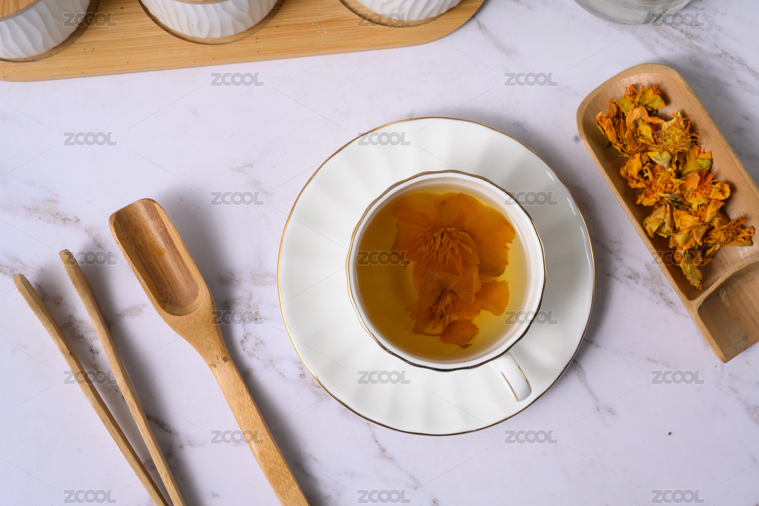 桌面上的杯子里的香甜可口的牡丹花苞茶