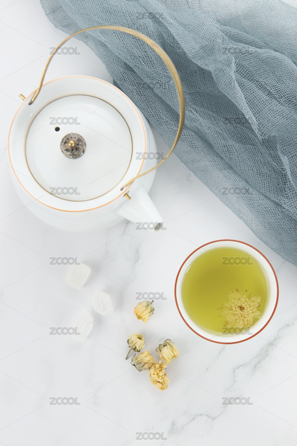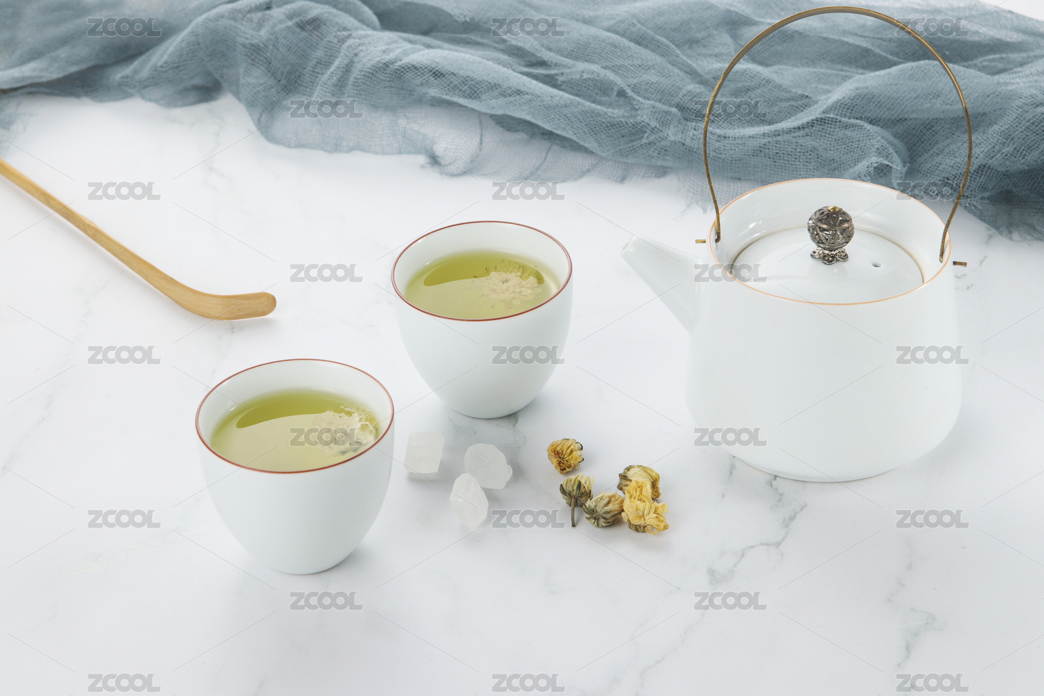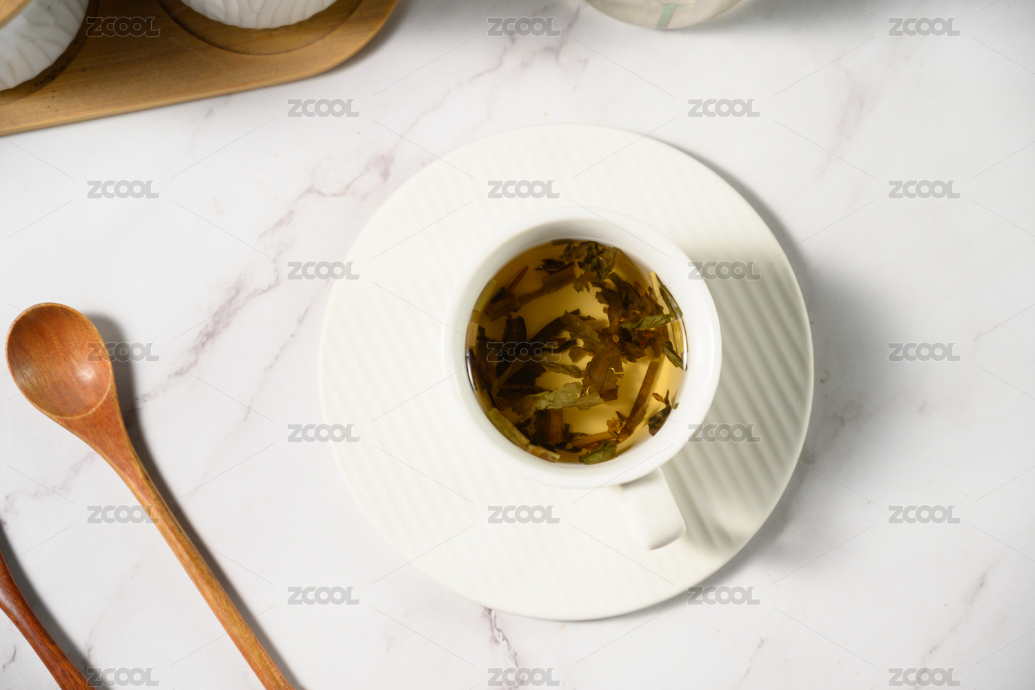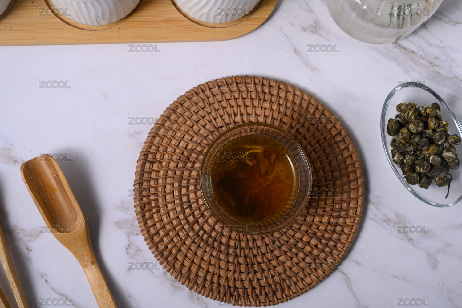 桌面上的杯子里的甘甜可口的茉莉吐珠茶